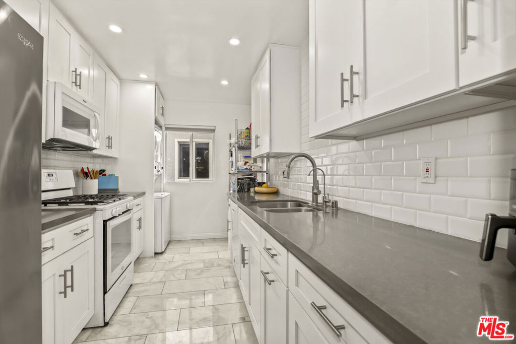 Perched on the top floor in one of West LA's most desirable locations, this beautifully remodeled 3-bedroom, 2-bath residence offers the perfect blend of comfort, style, and convenience within the highly sought-after Westwood Charter School District. Filled with natural light, the expansive open-concept living space creates an inviting atmosphere for both everyday living and entertaining. The spacious living room is anchored by a cozy gas fireplace and opens to a private balcony perfect for enjoying morning coffee or relaxing in the evening. Elegant laminate wood flooring flows throughout the main living areas and into a dedicated dining space, enhancing the home's warm and airy feel. The thoughtfully designed kitchen features sleek quartz countertops, classic white shaker cabinetry, a refrigerator with water and ice dispenser, and abundant counter space for cooking and gathering. A generous walk-in pantry in the hallway provides exceptional storage and functionality. All three bedrooms are generously sized, with two offering spacious walk-in closets, including the tranquil primary suite. The primary bedroom serves as a peaceful retreat with its own en-suite bathroom featuring dual vanities with quartz countertops and a beautifully designed walk-in shower. Two of the bedrooms also share access to a large private balcony, creating an additional outdoor space to relax and enjoy the fresh air. Additional highlights include an in-unit washer and dryer, a modern ductless heating and cooling system for year-round comfort, side-by-side parking, and a private storage unit located in the garage. Ideally located just moments from UCLA, this exceptional home places you close to Westwood's vibrant dining, Sawtelle restaurants, shopping, and entertainment while offering the privacy and comfort of a top-floor residence with easy nearby public transportation to get you whenever you need to go quickly!