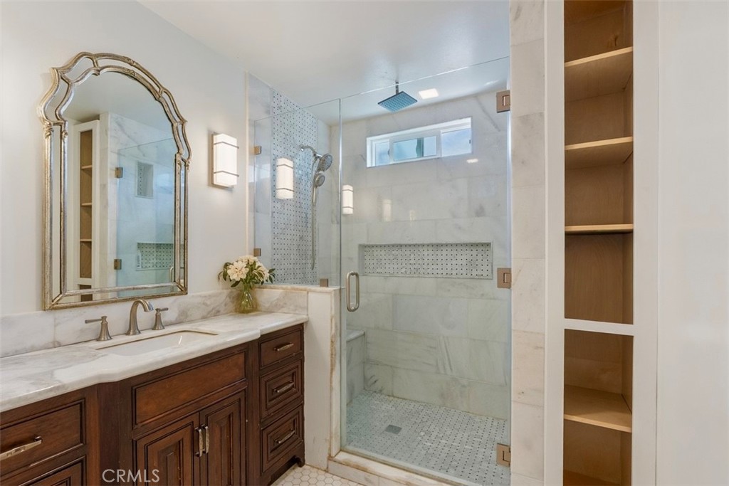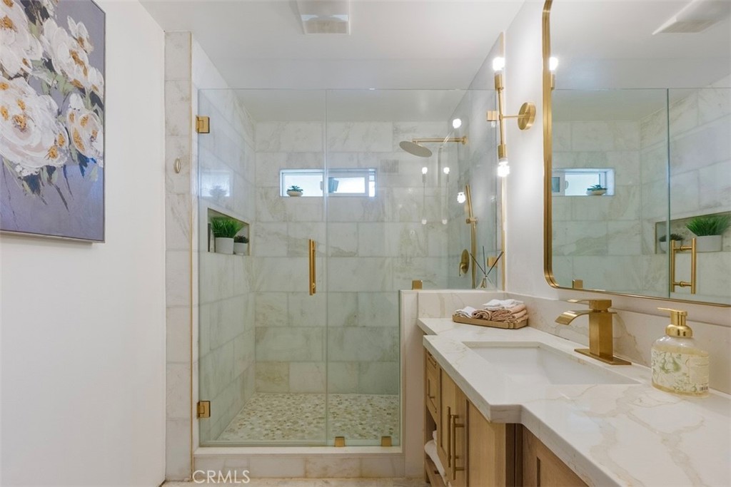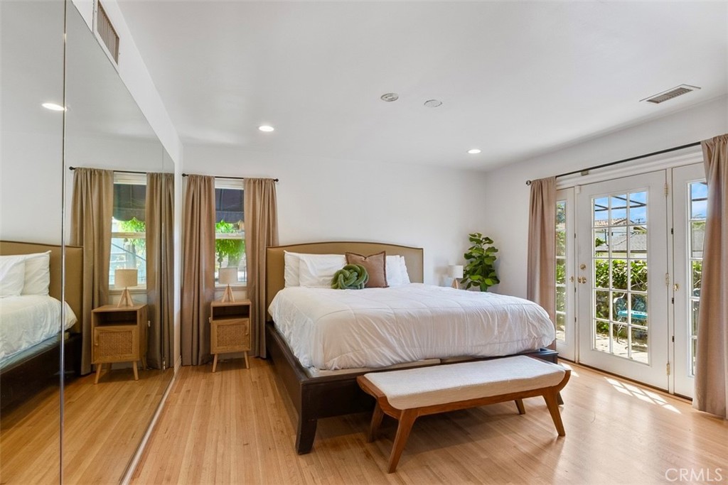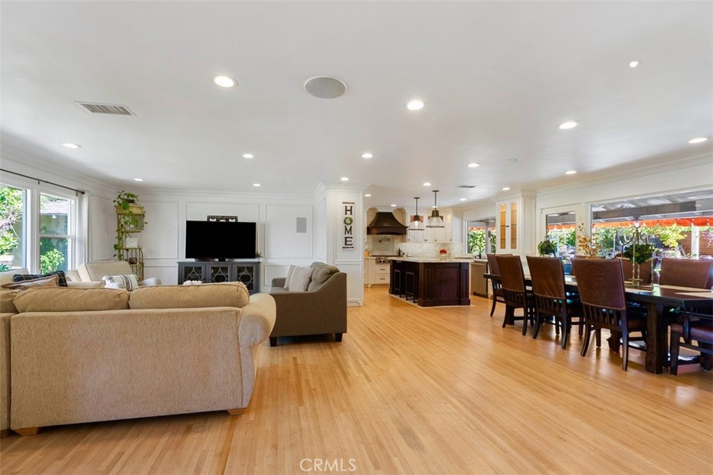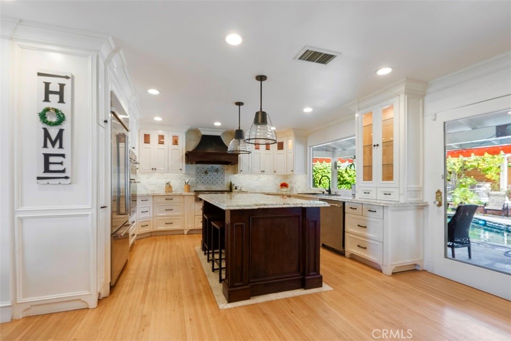 Back in the main portion of the home, two additional bedrooms offer generous closet space and share a beautifully updated guest bathroom featuring a modern walk-in shower. Inside, beautifully refinished original hardwood floors and an open-concept layout seamlessly connect the living room, dining area, and kitchen. Large windows fill the home with natural light while offering views of both the landscaped front yard and the spectacular backyard retreat. The spacious kitchen is designed for gathering and entertaining, featuring natural stone countertops, stainless steel appliances, custom cabinetry, a statement range hood, and a large center island with seating and ample storage.