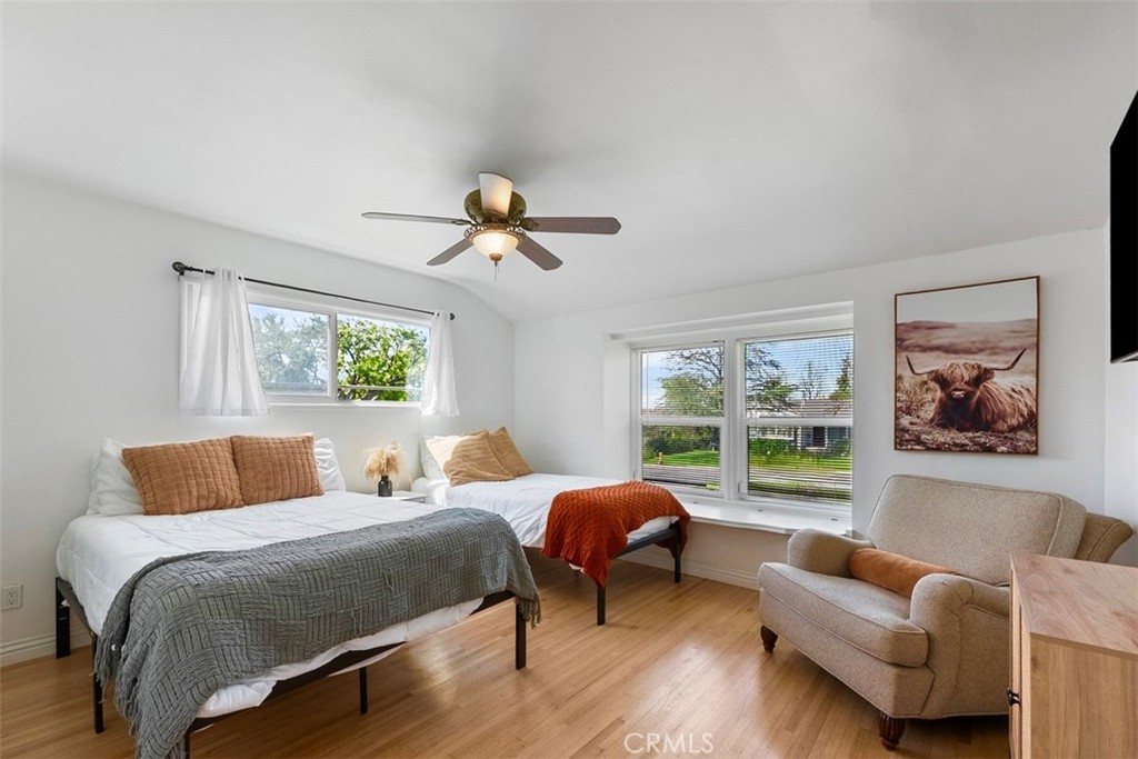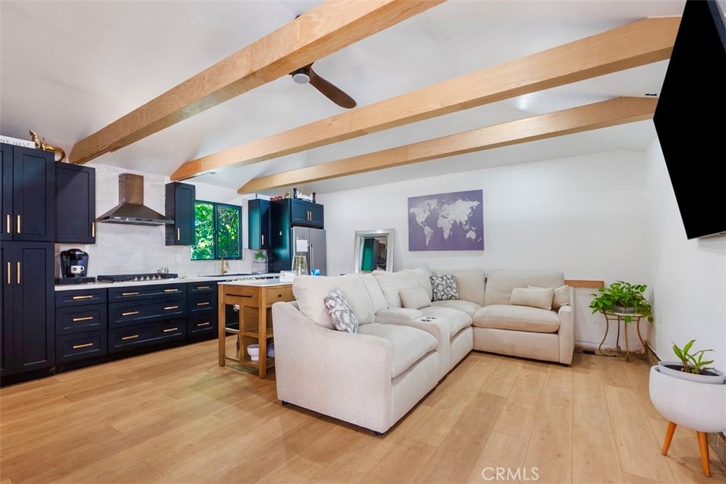 The property features 3 bedrooms and 2 fully remodeled bathrooms. One wing of the home includes a private primary suite with vaulted ceilings and its own en-suite bathroom. This section of the home is currently separated from the main living area and connects to a converted garage space configured with a living area and kitchenette, creating an excellent opportunity for multi-generational living, guest quarters, or potential ADU use. This private wing also enjoys its own separate side yard, offering added privacy and flexibility.