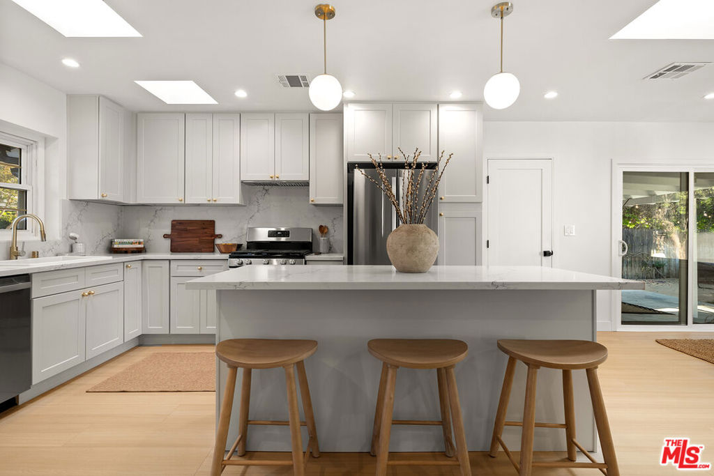Tucked away at the end of a quiet cul-de-sac in a highly desirable pocket of Woodland Hills, just moments from Walnut Acres, this thoughtfully reimagined single-story residence blends modern design with effortless California living. The home features 3 bedrooms and 2 bathrooms, all brought together by a bright, open-concept layout designed for both everyday comfort and seamless entertaining. Every detail has been carefully curated, showcasing quality craftsmanship and elevated finishes throughout. The primary suite serves as a private retreat, complete with a beautifully redesigned bathroom featuring floor-to-ceiling tile, dual vanities, custom cabinetry, and a spacious walk-in shower. A generous walk-in closet adds both function and luxury. Two additional bedrooms and an updated secondary bath offer flexibility for family, guests, or a home office. At the heart of the home, the kitchen is both stylish and functional, equipped for those who love to cook and perfectly positioned to connect with the dining area and center island, creating a natural gathering space. Set on an approximately 6,700 square foot lot, the outdoor space is designed for easy living and entertaining. The backyard features a mix of decomposed granite, gravel, garden boxes and large grassy yard, offering multiple areas to relax from evenings around the fire pit under string lights to covered patio dining year-round. Extensive upgrades include a new HVAC system, Google Nest Thermostat, updated electrical panel, new roof and gutters, luxury vinyl flooring, and a two-car garage with direct access.Ideally located near premier shopping and dining at Westfield Topanga & The Village, The Commons at Calabasas, and Warner Center, with access to top-rated charter schools including El Camino Real Charter High School and George Ellery Hale Charter Academy. A turnkey opportunity in one of the Valley's most sought-after neighborhoods offering style, function, and location all in one.