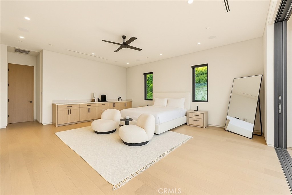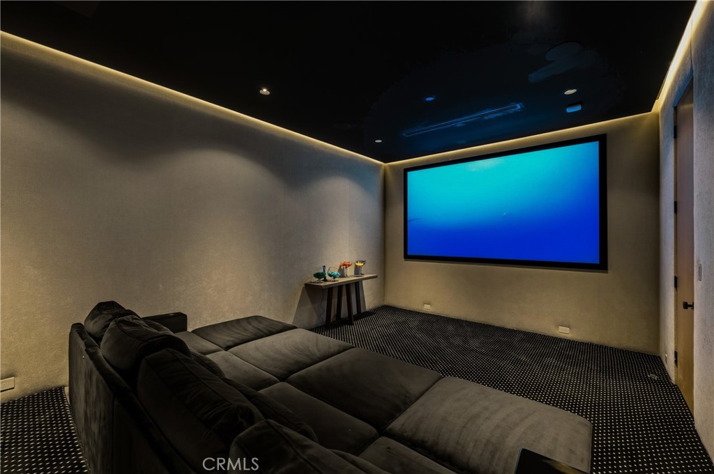 Entertainment reaches new heights with a private movie theater and a stunning outdoor environment. The cabana—with a full outdoor kitchen and BBQ—is ideal for hosting or relaxing. Car enthusiasts will appreciate the 13.6-ft RV garage with hookups, the attached two-car garage, and an additional two-car garage in the backyard. An electric automatic pocket door offers seamless access to the outdoor spaces.