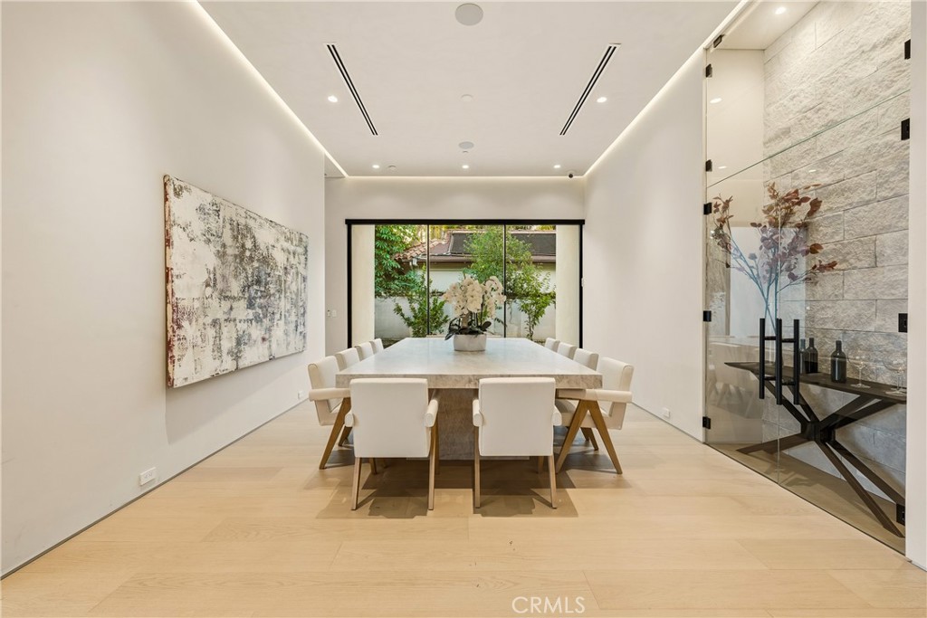The open-concept layout flows into a gourmet kitchen that’s a dream for culinary enthusiasts and entertainers. Taj Mahal stone countertops and state-of-the-art appliances set the stage, complemented by a secondary “dirty kitchen” for additional prep space. A custom Taj Mahal dining table serves as an elegant centerpiece for memorable gatherings.