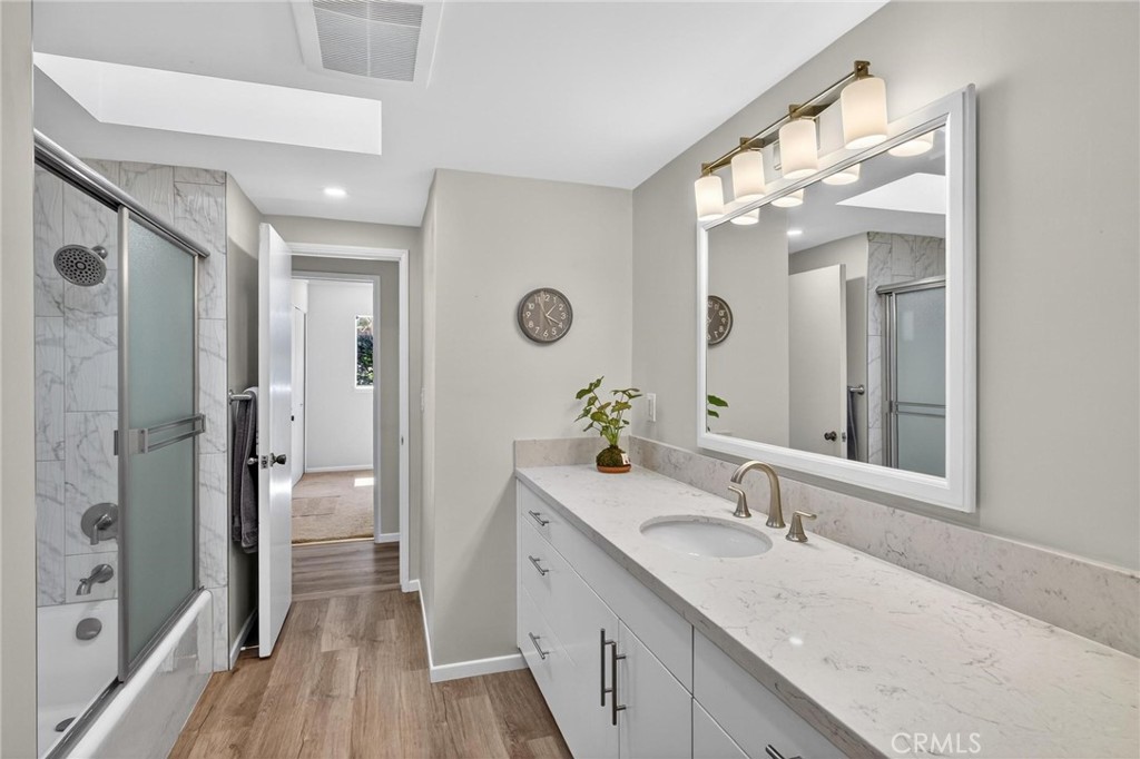 The private primary suite is thoughtfully separated from the other bedrooms, offering retreat, while three additional bedrooms share a conveniently located hallway bathroom with skylight.