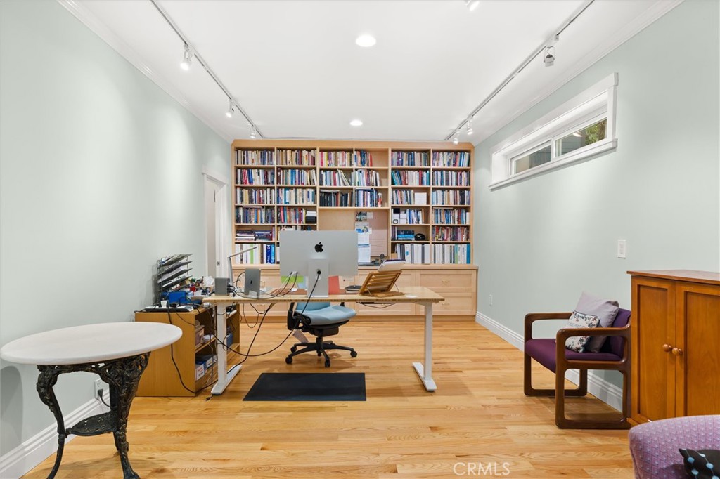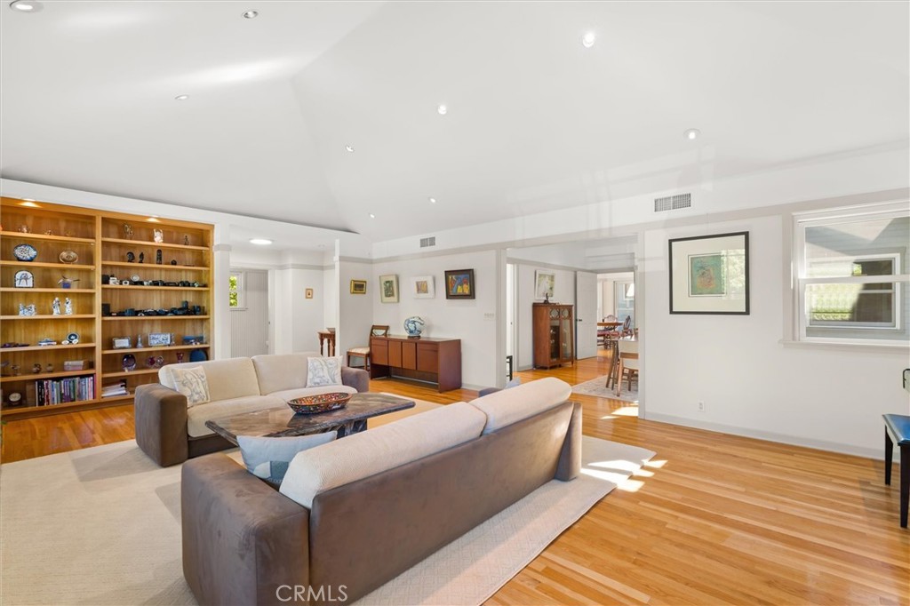 This charming, spacious craftsman style home, situated in one of Pasadena's most sought after neighborhoods, was built in 1992 by a well-known local developer and real estate broker as his main residence. This high quality home includes all modern amenities. The current owner beautifully renovated the kitchen, three bathrooms, and the lower level. The inviting entry features beautiful hardwood floors, which span both levels. There is a guest bathroom off the entry. The spacious formal living room has a vaulted ceiling, a fireplace with gas starter, built-in bookcase, and recessed lighting. The formal dining room features antique stained glass windows. The renovated gourmet kitchen with skylights and vaulted ceiling includes a Sub-Zero refrigerator/freezer, Wolf convection cooktop & oven, as well as microwave, and lots of storage. The breakfast nook is conveniently located between the kitchen and the family room with a view of the lovely courtyard. The family room with built-in cabinets and bookshelves also has a vaulted ceiling and recessed lighting. The main bedroom suite with vaulted ceiling and skylight offers a ceiling fan, recessed lighting, built-in entertainment cabinet/bookcases, and walk-in closet. The main bathroom has dual sinks and an oversized steam shower. There are two additional family bedrooms with built-in storage, which are serviced by the hallway bathroom. The office/den (could be 4th bedroom) features attractive French doors that open up to a sun deck/patio. The lower level adds exceptional flexibility, with an oversized multi-purpose room perfect for a large home office, creative studio, or recreation space, complete with a dedicated file room. This level also includes a separate laundry room with secured storage and a full bathroom with jacuzzi tub. The two car garage with an automatic opener, offers plenty of cabinets and an EV charger. Other highlights of this home are the dual zone HVAC systems, solar panels, two tankless water heaters, and new desert landscaping with drip irrigation and lights. This extraordinary home offers a rare combination of quality, comfort, and modern convenience in a premier Pasadena location.
