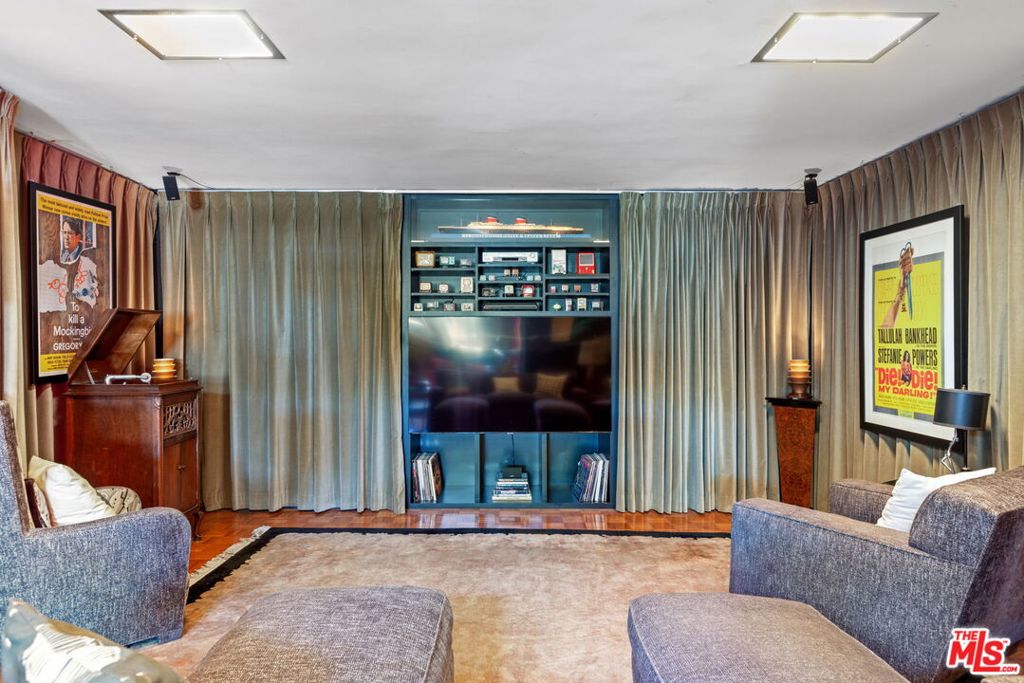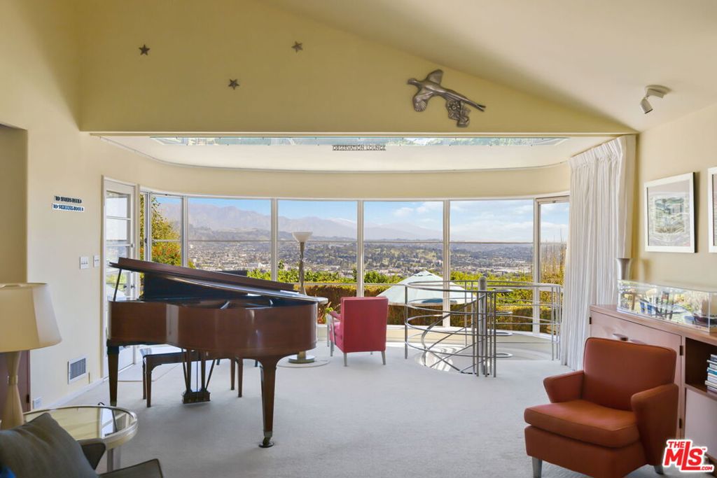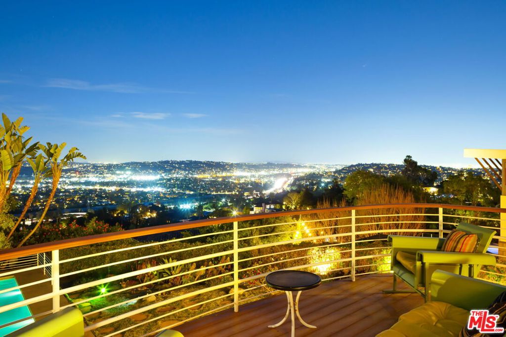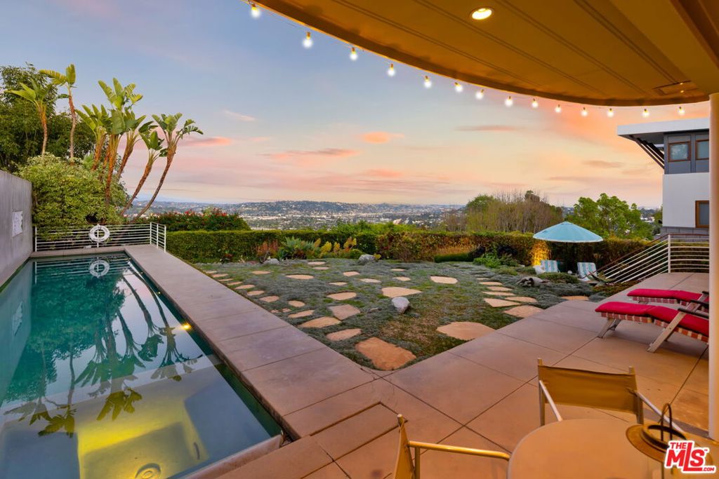 Set above the city with sweeping, panoramic views, this streamline moderne residence offers a rare blend of character, volume, timeless design, and classic Hollywood glamor. Spanning approximately 3,132 square feet, this 4-bedroom, 4-bathroom home is thoughtfully designed to embrace both comfortable daily living and exceptional entertaining. A dramatic living room welcomes you with soaring ceilings, expansive walls for art, and abundant natural light pouring through walls of glass that frame the stunning vistas beyond. A striking spiral staircase adds a sculptural focal point while leading to a private media/screening room complete with wet bar and powder room---an ideal retreat for entertainment and relaxation. The adjacent dining room is perfectly suited for both intimate gatherings and larger-scale entertaining, seamlessly connected to the home's open and airy layout. The kitchen retains its classic charm while offering generous workspace, an adjoining butler's pantry, and convenient access to the main living areas. A dedicated laundry area and additional service spaces enhance everyday functionality. The first floor also features a versatile den/office with bath, ideal for a home workspace, along with a separate guest or maid's bedroom and bath, offering flexibility for a variety of living arrangements. Upstairs, the primary suite serves as a private retreat, complete with its own luxurious bath and direct access to an expansive upper deck perfect for taking in morning light or evening sunsets. A second bedroom, currently configured as an office, also opens to the deck, creating a seamless indoor-outdoor connection. A third bedroom completes the upper level and shares a Jack-and-Jill bath. Outdoor living is equally compelling, featuring a covered patio overlooking a pool and spa, all set against breathtaking views. A step-down seating area with a fountain provides an additional intimate space for relaxation or entertaining, enhancing the home's tranquil and resort-like atmosphere. Throughout, unique streamline moderne architectural elements, curated interiors, and an undeniable sense of personality create a one-of-a-kind living experience. Only the second time on the market, this residence was featured in the L.A. Times Home Section in November 2006---offering a rare opportunity to own a home that combines architectural interest, functional design, and an exceptional setting.