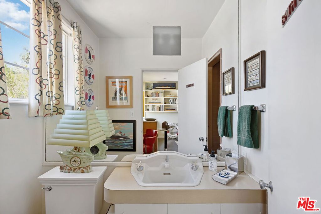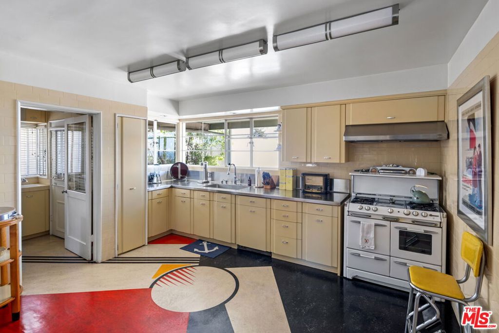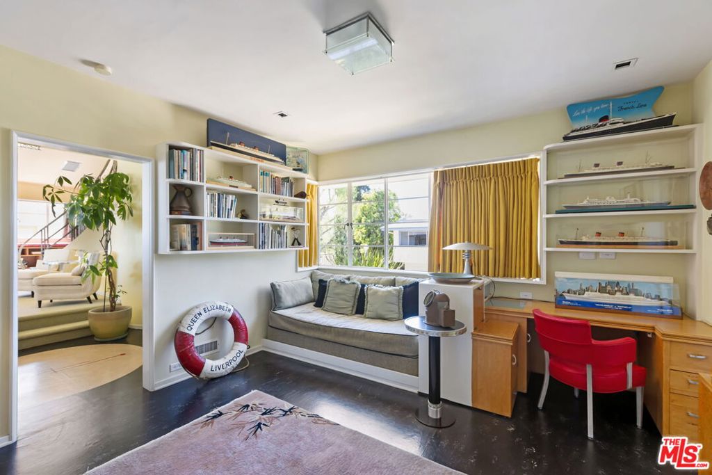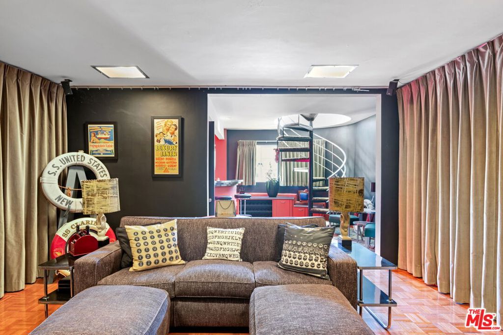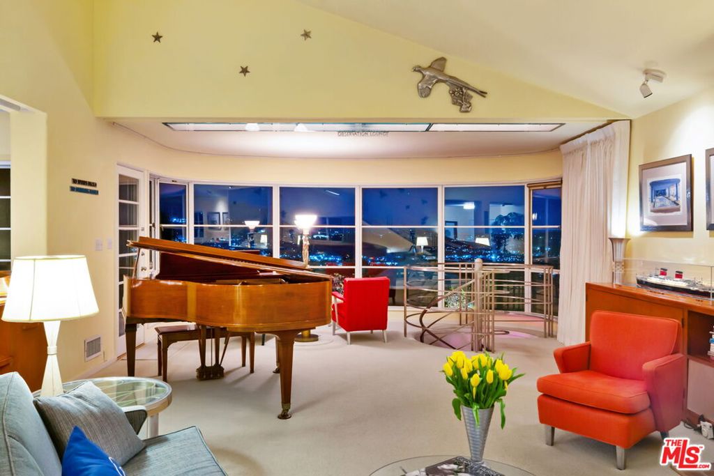 Set above the city with sweeping, panoramic views, this streamline moderne residence offers a rare blend of character, volume, timeless design, and classic Hollywood glamor. Spanning approximately 3,132 square feet, this 4-bedroom, 4-bathroom home is thoughtfully designed to embrace both comfortable daily living and exceptional entertaining. A dramatic living room welcomes you with soaring ceilings, expansive walls for art, and abundant natural light pouring through walls of glass that frame the stunning vistas beyond. A striking spiral staircase adds a sculptural focal point while leading to a private media/screening room complete with wet bar and powder room---an ideal retreat for entertainment and relaxation. The adjacent dining room is perfectly suited for both intimate gatherings and larger-scale entertaining, seamlessly connected to the home's open and airy layout. The kitchen retains its classic charm while offering generous workspace, an adjoining butler's pantry, and convenient access to the main living areas. A dedicated laundry area and additional service spaces enhance everyday functionality. The first floor also features a versatile den/office with bath, ideal for a home workspace, along with a separate guest or maid's bedroom and bath, offering flexibility for a variety of living arrangements. Upstairs, the primary suite serves as a private retreat, complete with its own luxurious bath and direct access to an expansive upper deck perfect for taking in morning light or evening sunsets. A second bedroom, currently configured as an office, also opens to the deck, creating a seamless indoor-outdoor connection. A third bedroom completes the upper level and shares a Jack-and-Jill bath. Outdoor living is equally compelling, featuring a covered patio overlooking a pool and spa, all set against breathtaking views. A step-down seating area with a fountain provides an additional intimate space for relaxation or entertaining, enhancing the home's tranquil and resort-like atmosphere. Throughout, unique streamline moderne architectural elements, curated interiors, and an undeniable sense of personality create a one-of-a-kind living experience. Only the second time on the market, this residence was featured in the L.A. Times Home Section in November 2006---offering a rare opportunity to own a home that combines architectural interest, functional design, and an exceptional setting.