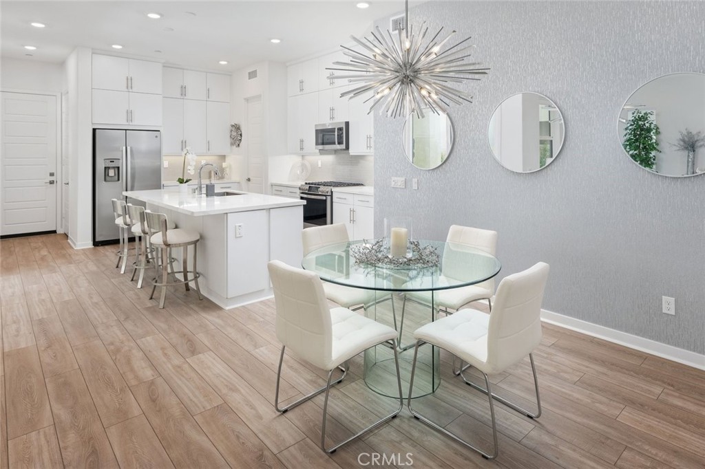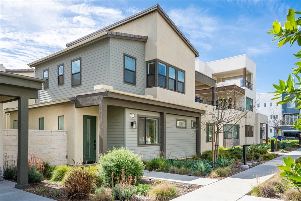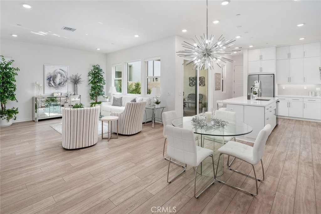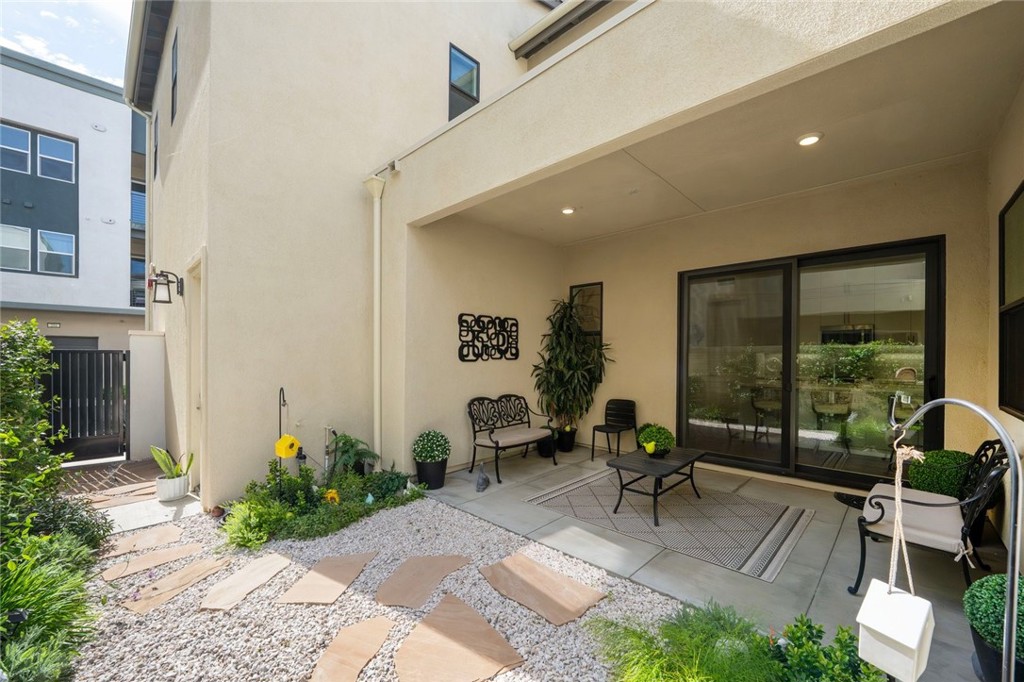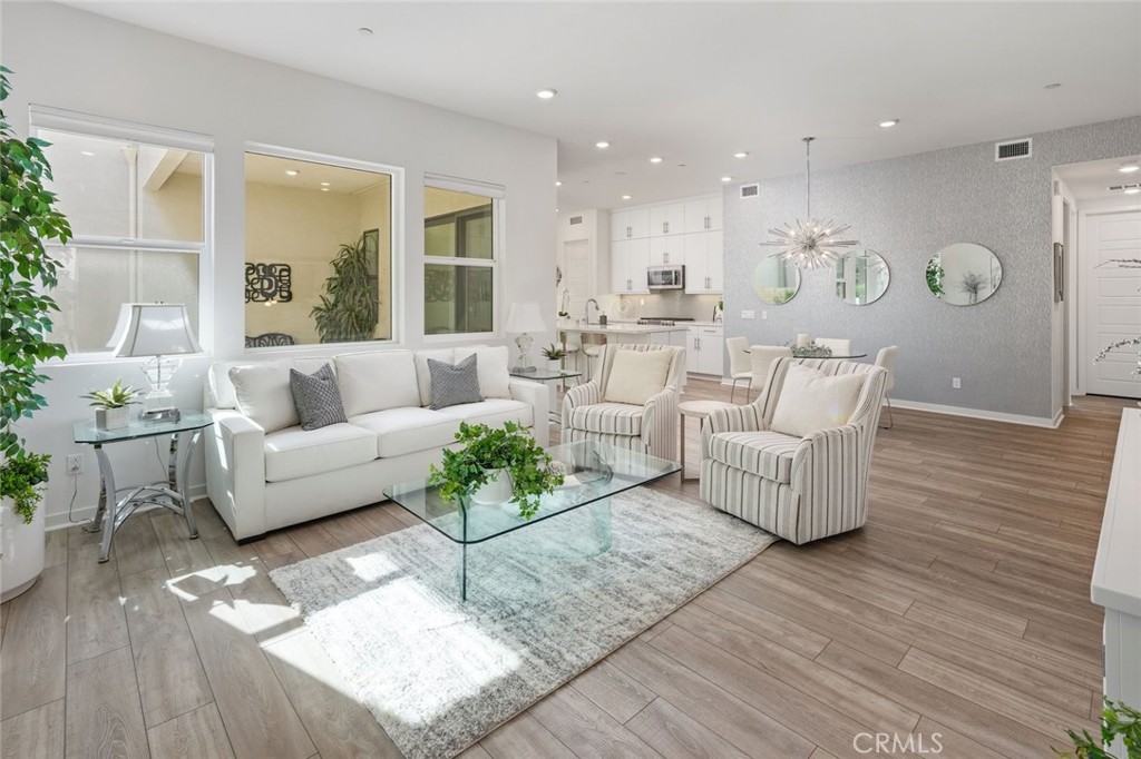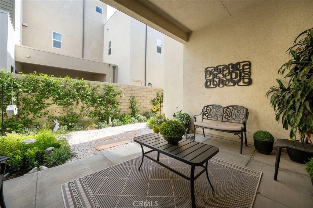 Absolutely stunning and rare 3 bed, 2 bath SINGLE STORY home in the highly sought after Rowan collection in Valencia's coveted FivePoint community. Beautifully appointed modern home featuring an open-concept floor plan with high ceilings, large picture windows, luxury vinyl plank flooring, and tons of designer upgrades. Can be purchased fully furnished! Step inside to the large living room bathed in natural light with views of the lovely courtyard through the oversized picture windows. The bright and airy living area flows seamlessly into the dining space featuring a beautiful feature wall and eye-catching chandelier. The gourmet kitchen is an entertainer's dream, showcasing quartz countertops, a huge island, designer backsplash, beautiful white cabinetry with brushed nickel hardware, a walk-in pantry, and high end stainless-steel appliances. From the kitchen, step through sliding glass doors to the charming and spacious covered courtyard - perfect for relaxing or outdoor get togethers. The primary suite offers plush carpeting, recessed lighting, custom window coverings, a generous walk-in closet, and a luxurious en-suite bathroom with dual quartz vanities and a walk-in shower. Two additional bedrooms include large closets, custom window coverings and abundant natural light. The full guest bath also features dual vanities, quartz counters, and a tub/shower combination. Additional highlights include a dedicated laundry room, attached two-car garage, and owned solar panels for enhanced energy efficiency. Residents of the FivePoint community enjoy resort-style amenities such as multiple pools, spas, cabanas, parks, walking trails, a recreation center, dog park, community garden, and a popular Sunday Farmer’s Market. Conveniently located near shopping, dining, and the 5 Freeway yet tucked away in a quiet community, this exceptional residence offers the perfect blend of elegance, comfort and convenience.