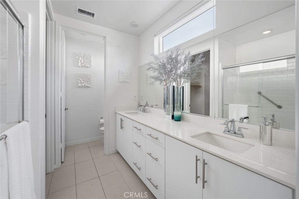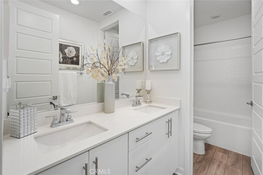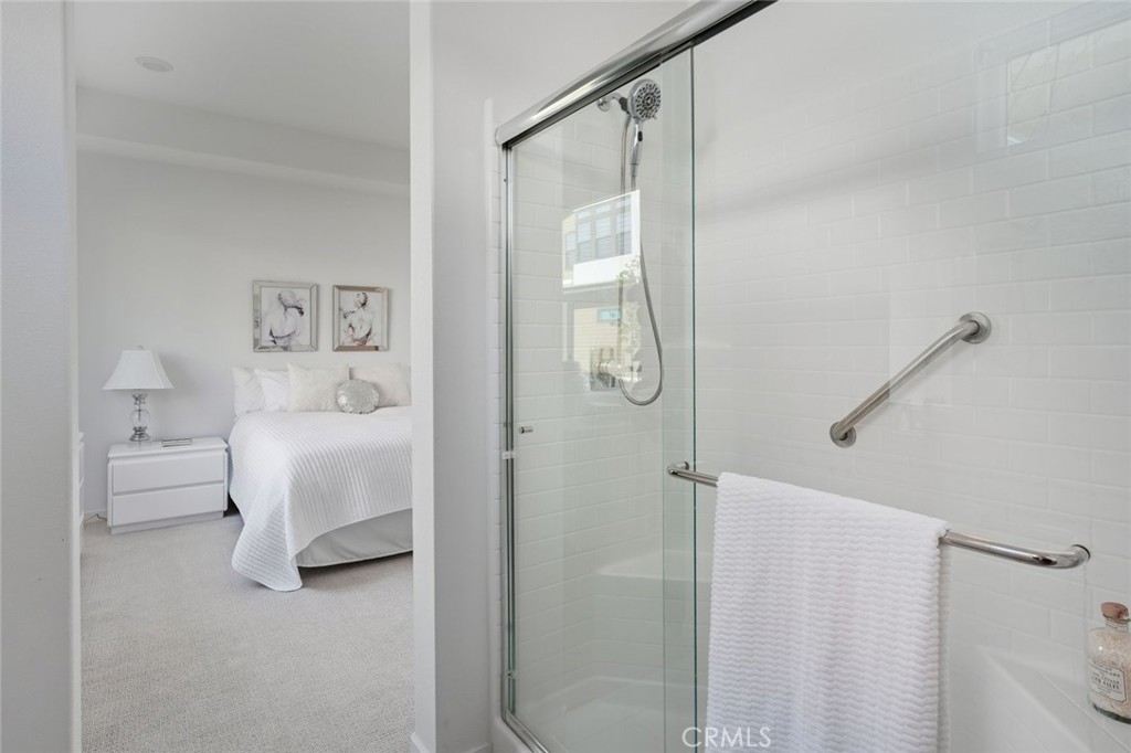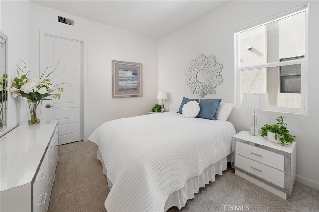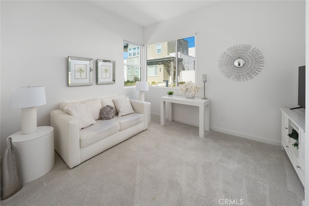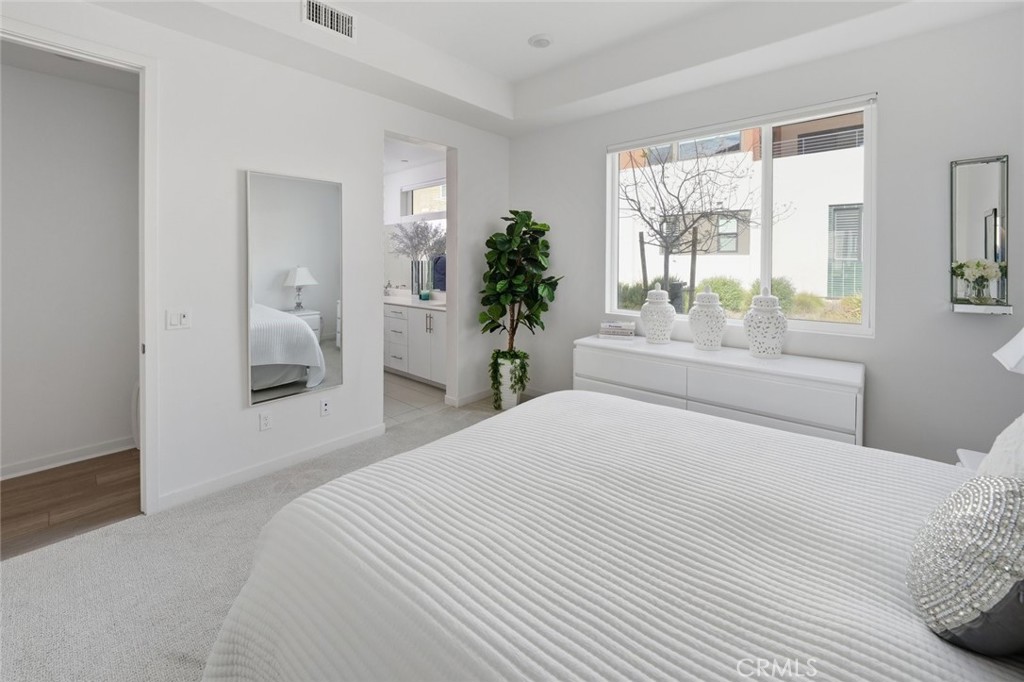 Absolutely stunning and rare 3 bed, 2 bath SINGLE STORY home in the highly sought after Rowan collection in Valencia's coveted FivePoint community. Beautifully appointed modern home featuring an open-concept floor plan with high ceilings, large picture windows, luxury vinyl plank flooring, and tons of designer upgrades. Can be purchased fully furnished! Step inside to the large living room bathed in natural light with views of the lovely courtyard through the oversized picture windows. The bright and airy living area flows seamlessly into the dining space featuring a beautiful feature wall and eye-catching chandelier. The gourmet kitchen is an entertainer's dream, showcasing quartz countertops, a huge island, designer backsplash, beautiful white cabinetry with brushed nickel hardware, a walk-in pantry, and high end stainless-steel appliances. From the kitchen, step through sliding glass doors to the charming and spacious covered courtyard - perfect for relaxing or outdoor get togethers. The primary suite offers plush carpeting, recessed lighting, custom window coverings, a generous walk-in closet, and a luxurious en-suite bathroom with dual quartz vanities and a walk-in shower. Two additional bedrooms include large closets, custom window coverings and abundant natural light. The full guest bath also features dual vanities, quartz counters, and a tub/shower combination. Additional highlights include a dedicated laundry room, attached two-car garage, and owned solar panels for enhanced energy efficiency. Residents of the FivePoint community enjoy resort-style amenities such as multiple pools, spas, cabanas, parks, walking trails, a recreation center, dog park, community garden, and a popular Sunday Farmer’s Market. Conveniently located near shopping, dining, and the 5 Freeway yet tucked away in a quiet community, this exceptional residence offers the perfect blend of elegance, comfort and convenience.