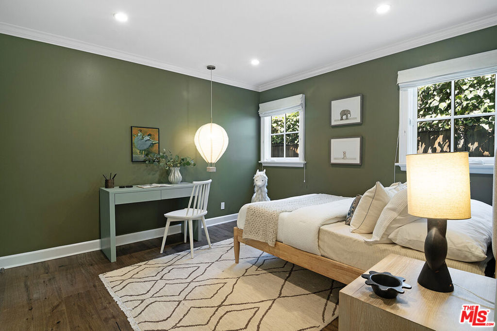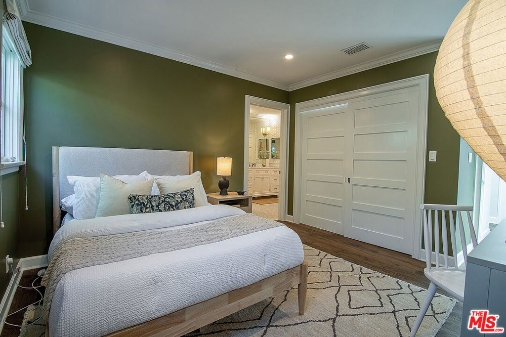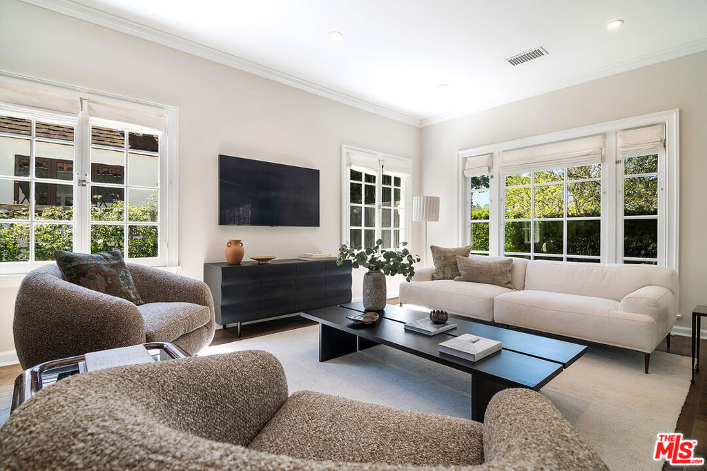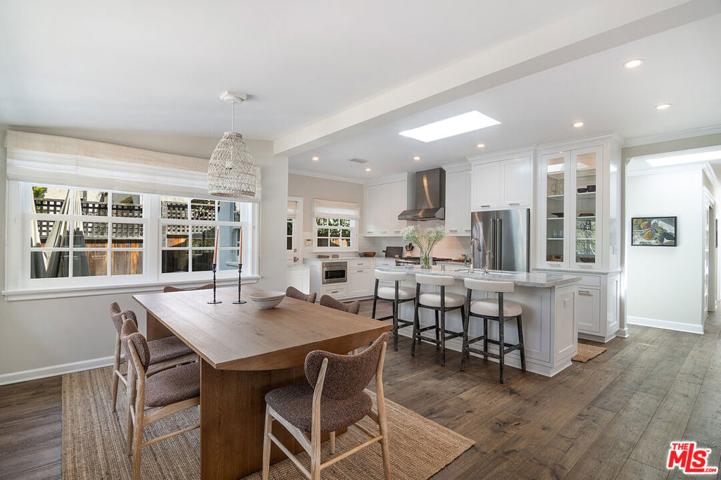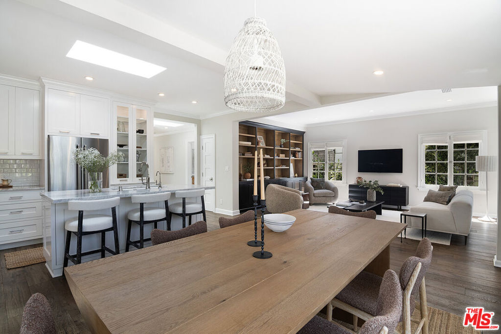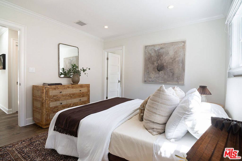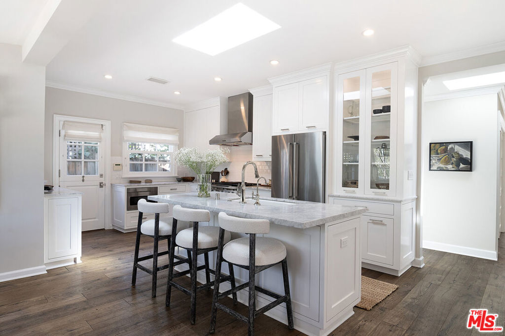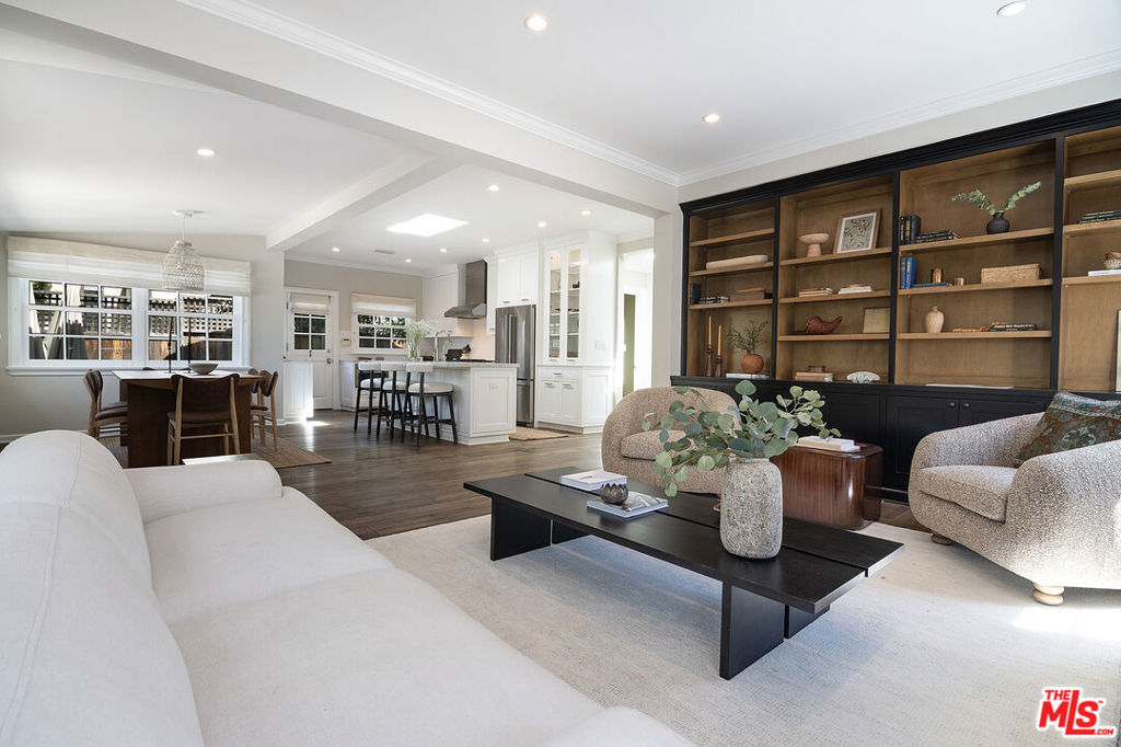 Entirely reimagined and designer remodeled ultra light + bright Single Story Bespoke Timeless Sophisticated Spanish set up for quintessential California indoor/outdoor living with 4 bedroom suites & sunshine everywhere in prime Miracle Mile location! Mini compound features open floor plan great for entertaining, wide plank wood floors, abundant natural light from large windows & skylights everywhere! Living room with built in wall unit is open to the dining room and kitchen. Gourmet kitchen has abundant storage + marble topped counter space, a center island with breakfast bar, Kitchenaid fridge/freezer + range + dishwasher, large skylight over the island, built-in microwave. Side door off the kitchen opens halfway for cross breeze. Coat closet and laundry room with generous storage in the hallway. 3 en-suite bedrooms in the main house each have beautifully appointed designer bathrooms. Center hallway flooded with light through skylight and 2 full glass doors. Primary bedroom is en suite with double French doors to the yard, large bath with double vanity + separate shower and tub + walk-in closet. 31 foot long pebble tech swimmers pool with jacuzzi + water feature + new pool cover in completely hedged private yard. Hardscape deck for lounging and dining alongside an outdoor architectural fireplace. Newer construction ADU opens with double doors to the new driveway and has a full kitchen and en-suite bath with shower. Award worthy artistic landscaping with olive trees and succulents. Hardwood floors, central HVAC, new roof, new wide driveway with remote access. CAT6 wiring throughout for Wifi, security cameras. Amazing location close to The Grove, shops and restaurants. The perfect mix of entirely reimagined in amazing designer timeless taste, flooded with sunshine, Spanish character in prime Miracle Mile location!