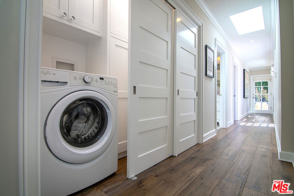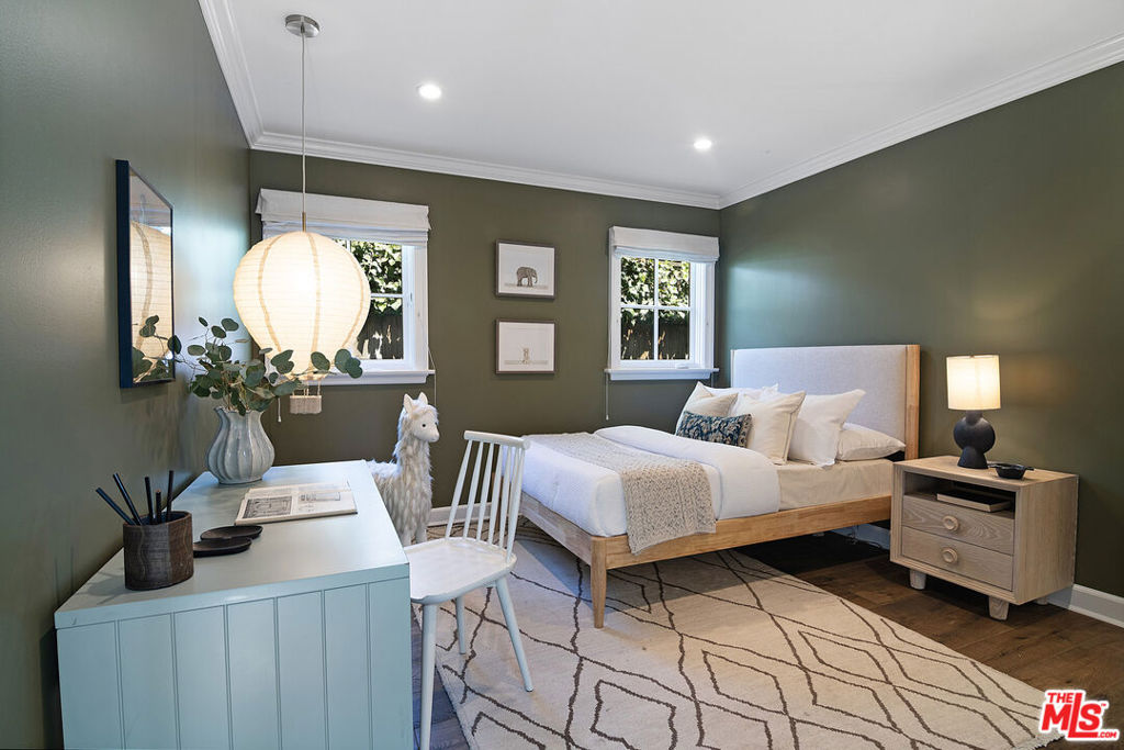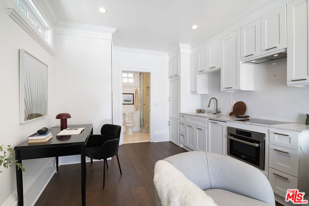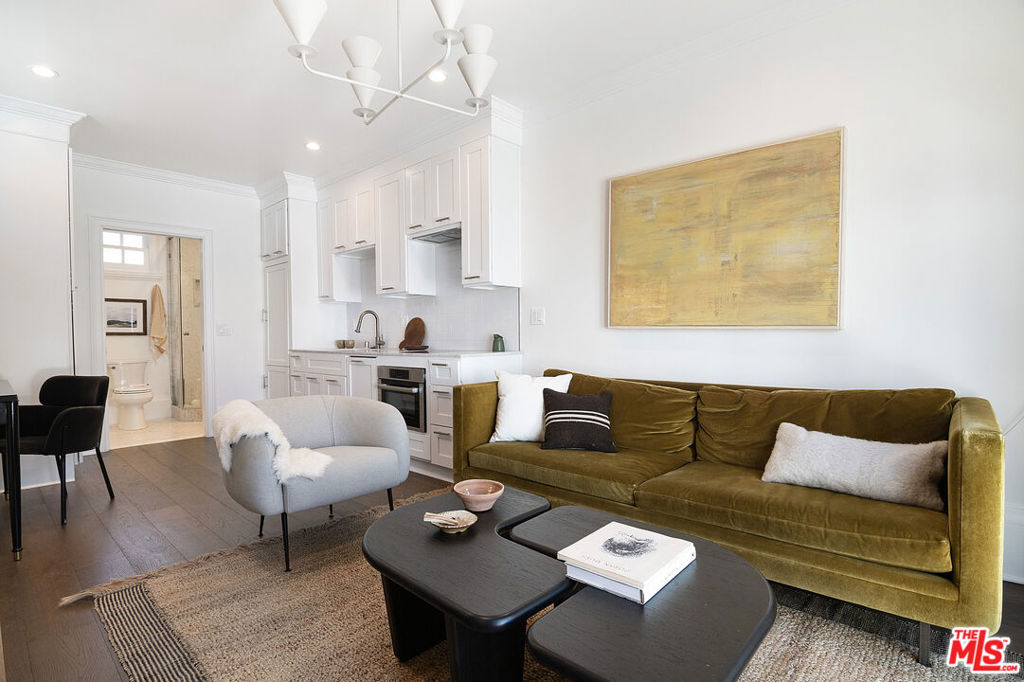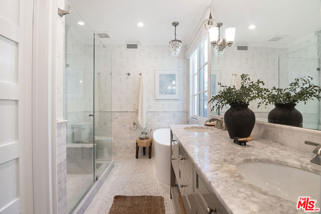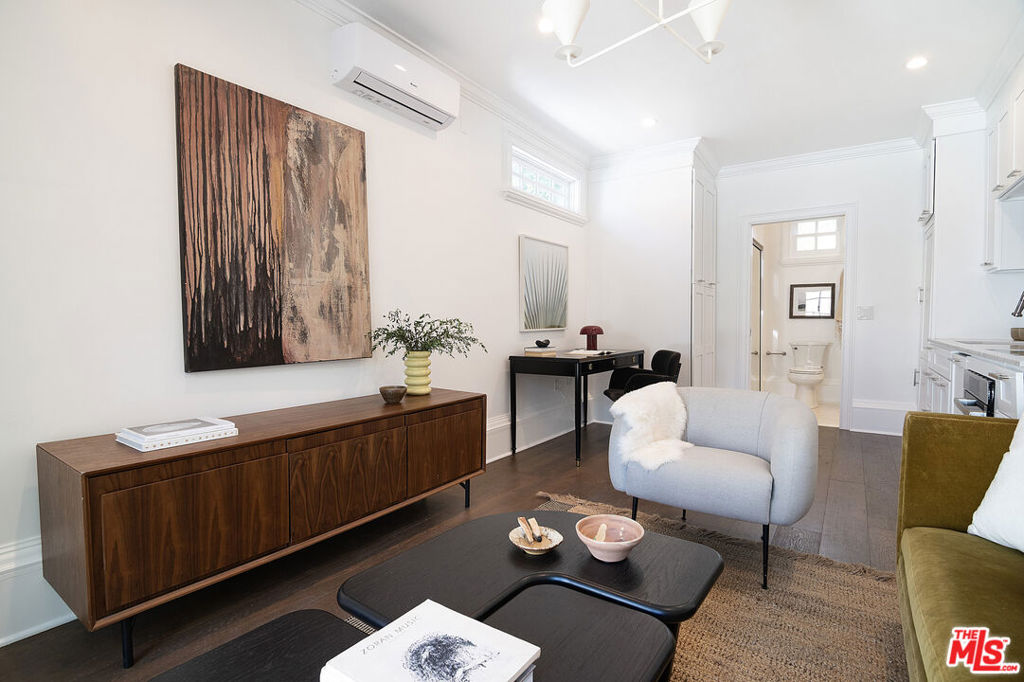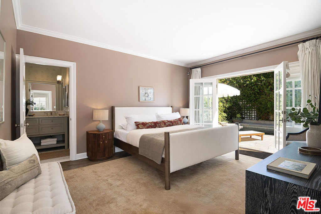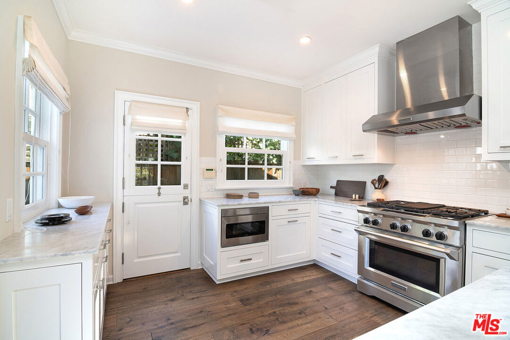 Entirely reimagined and designer remodeled ultra light + bright Single Story Bespoke Timeless Sophisticated Spanish set up for quintessential California indoor/outdoor living with 4 bedroom suites & sunshine everywhere in prime Miracle Mile location! Mini compound features open floor plan great for entertaining, wide plank wood floors, abundant natural light from large windows & skylights everywhere! Living room with built in wall unit is open to the dining room and kitchen. Gourmet kitchen has abundant storage + marble topped counter space, a center island with breakfast bar, Kitchenaid fridge/freezer + range + dishwasher, large skylight over the island, built-in microwave. Side door off the kitchen opens halfway for cross breeze. Coat closet and laundry room with generous storage in the hallway. 3 en-suite bedrooms in the main house each have beautifully appointed designer bathrooms. Center hallway flooded with light through skylight and 2 full glass doors. Primary bedroom is en suite with double French doors to the yard, large bath with double vanity + separate shower and tub + walk-in closet. 31 foot long pebble tech swimmers pool with jacuzzi + water feature + new pool cover in completely hedged private yard. Hardscape deck for lounging and dining alongside an outdoor architectural fireplace. Newer construction ADU opens with double doors to the new driveway and has a full kitchen and en-suite bath with shower. Award worthy artistic landscaping with olive trees and succulents. Hardwood floors, central HVAC, new roof, new wide driveway with remote access. CAT6 wiring throughout for Wifi, security cameras. Amazing location close to The Grove, shops and restaurants. The perfect mix of entirely reimagined in amazing designer timeless taste, flooded with sunshine, Spanish character in prime Miracle Mile location!
