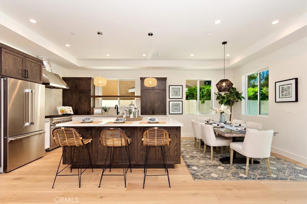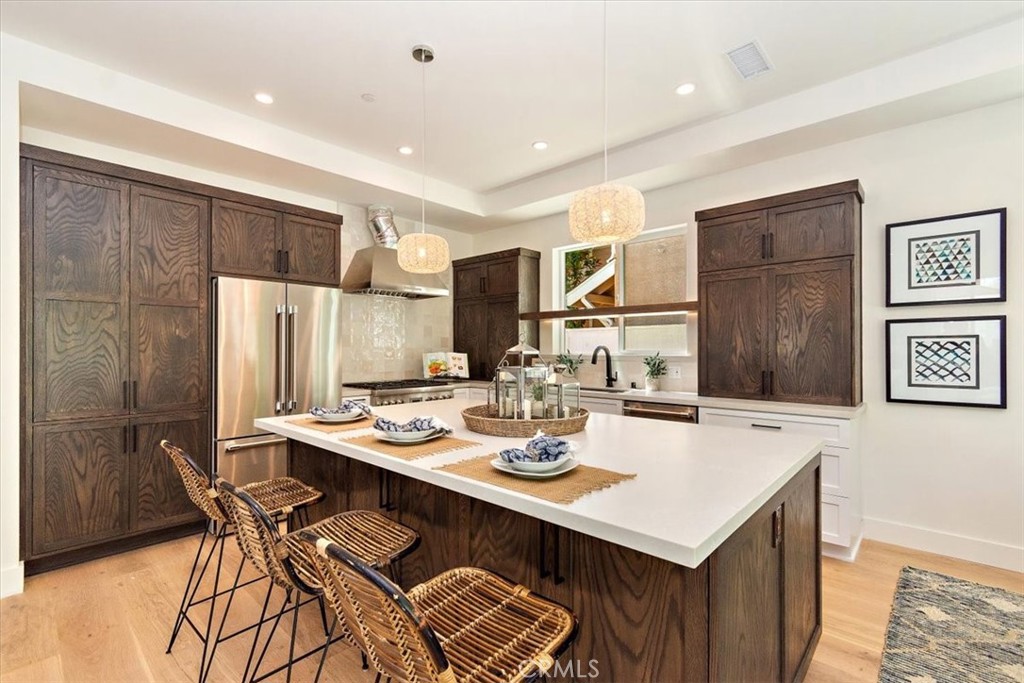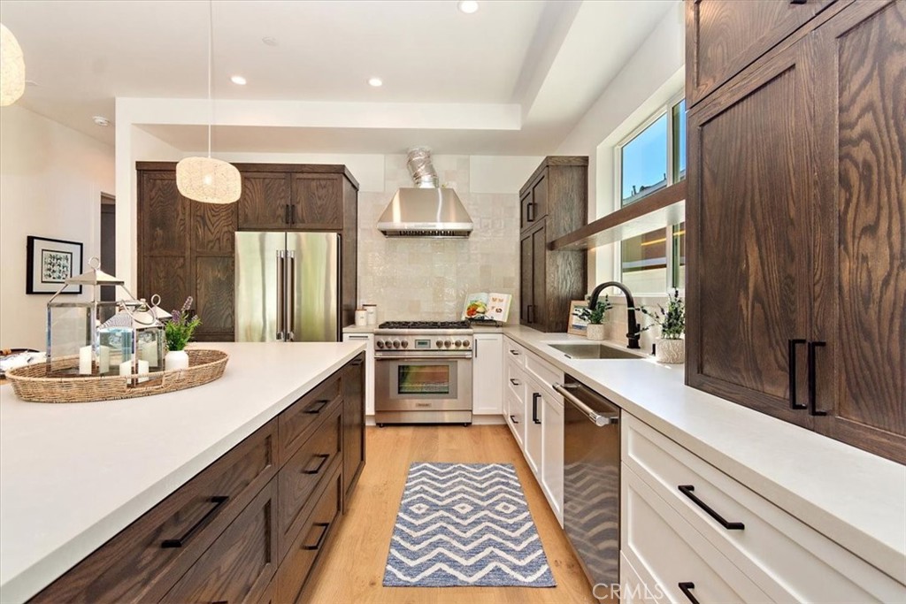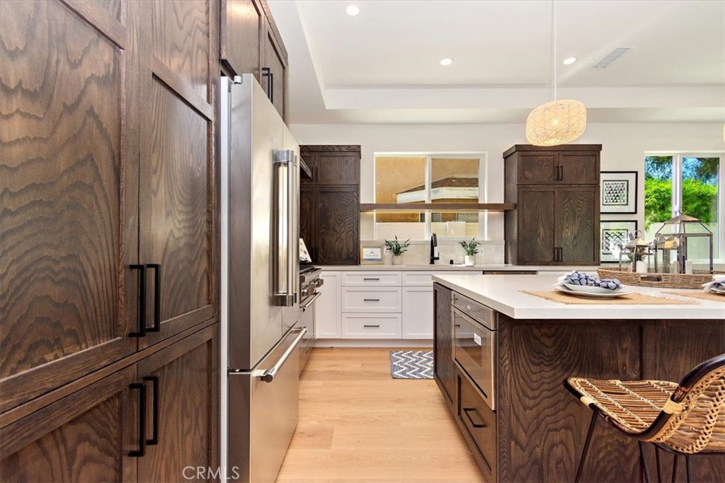 The gourmet kitchen is a culinary enthusiast's dream, complete with top-of-the-line Thermador stainless steel appliances, quartz countertops, a large center island, and ample storage space.