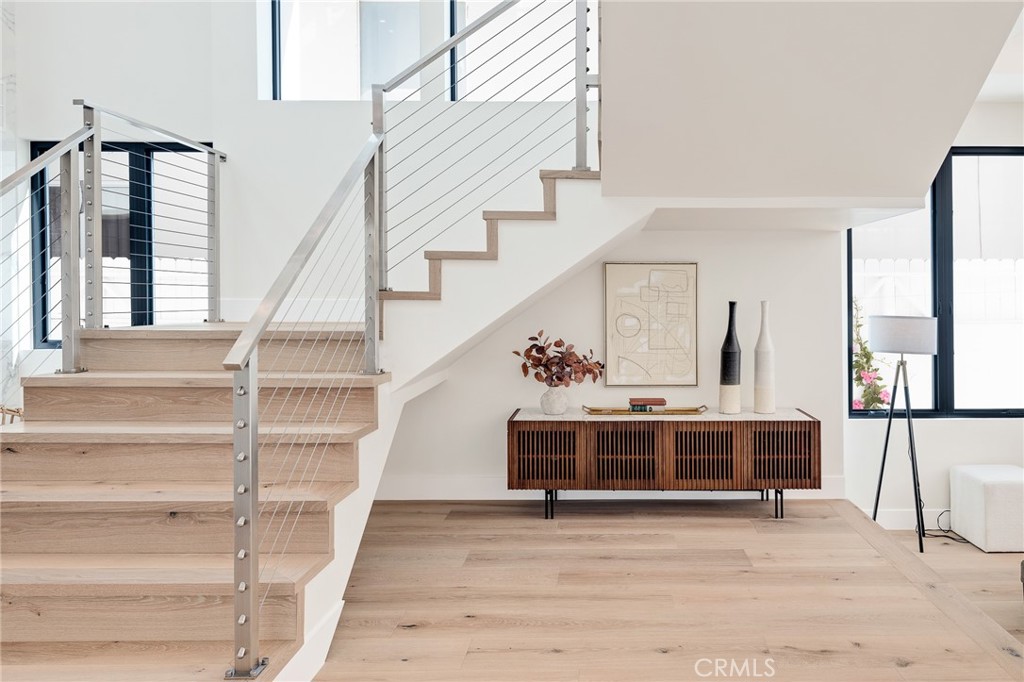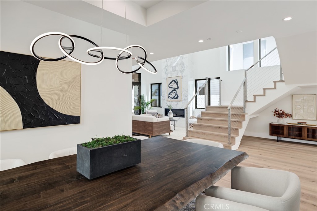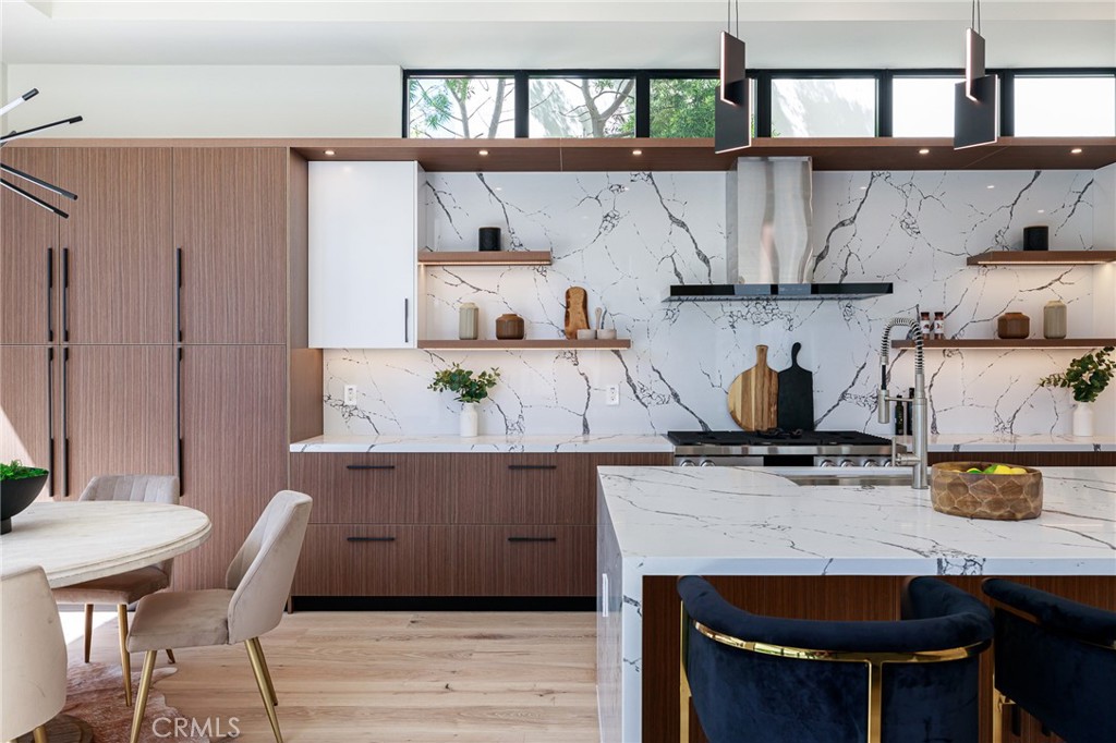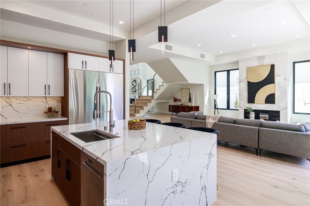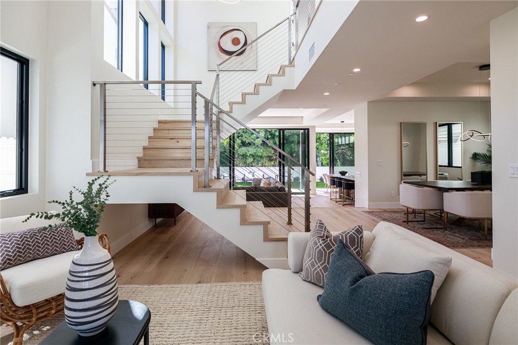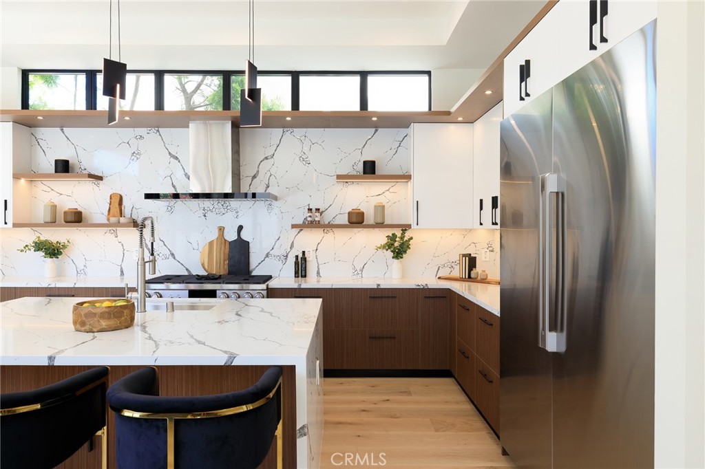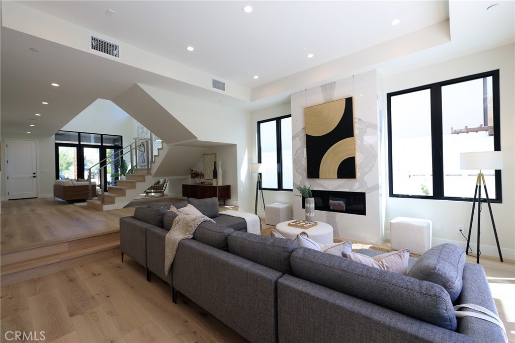 This home boasts two family rooms on the first level, both with fireplaces, separated by a stairway to the bedrooms and laundry above. White ash wood flooring throughout makes the transition from room to room visibly seamless. Loads of natural light filter through the over-sized windows. The Chef's kitchen is outfitted with Dacor appliances.