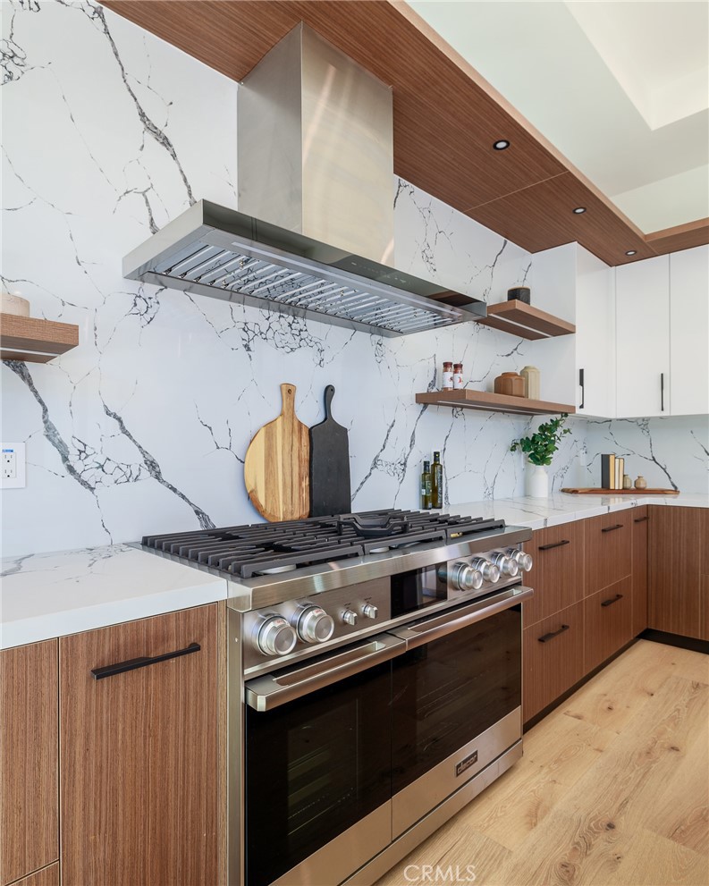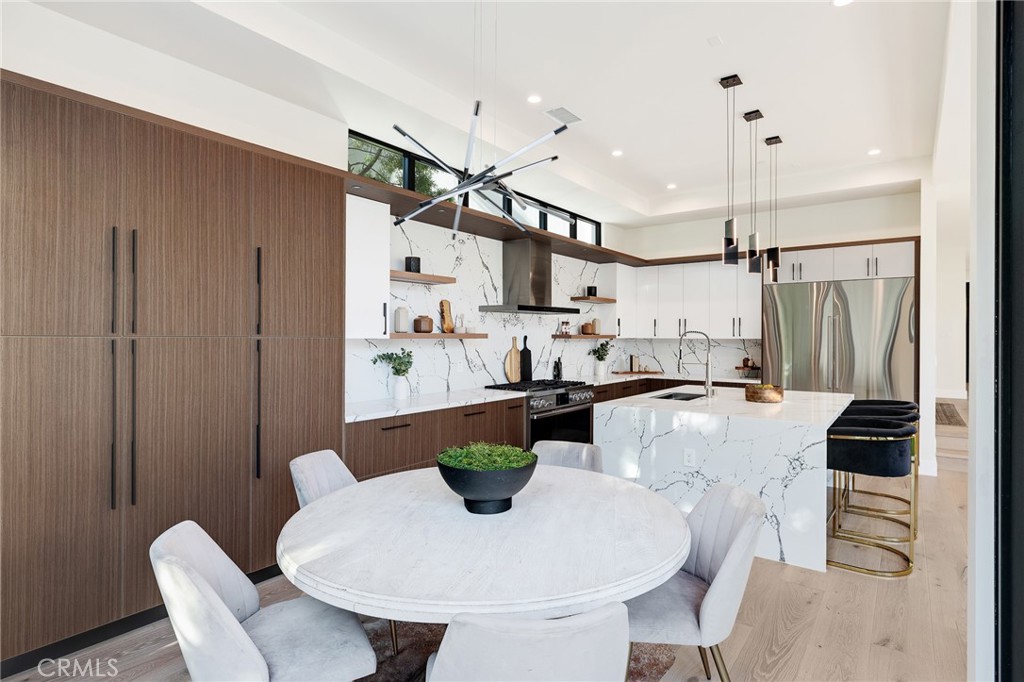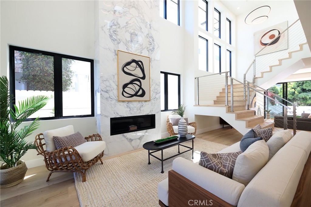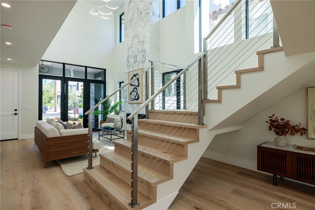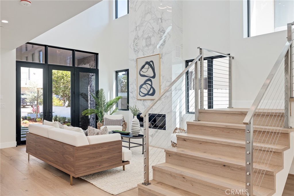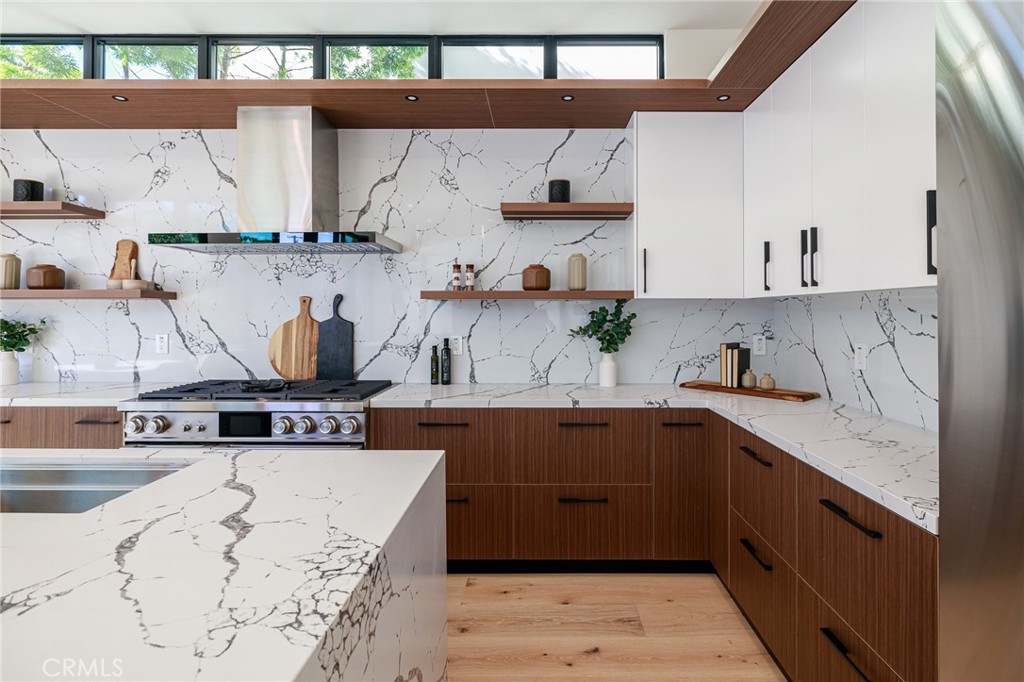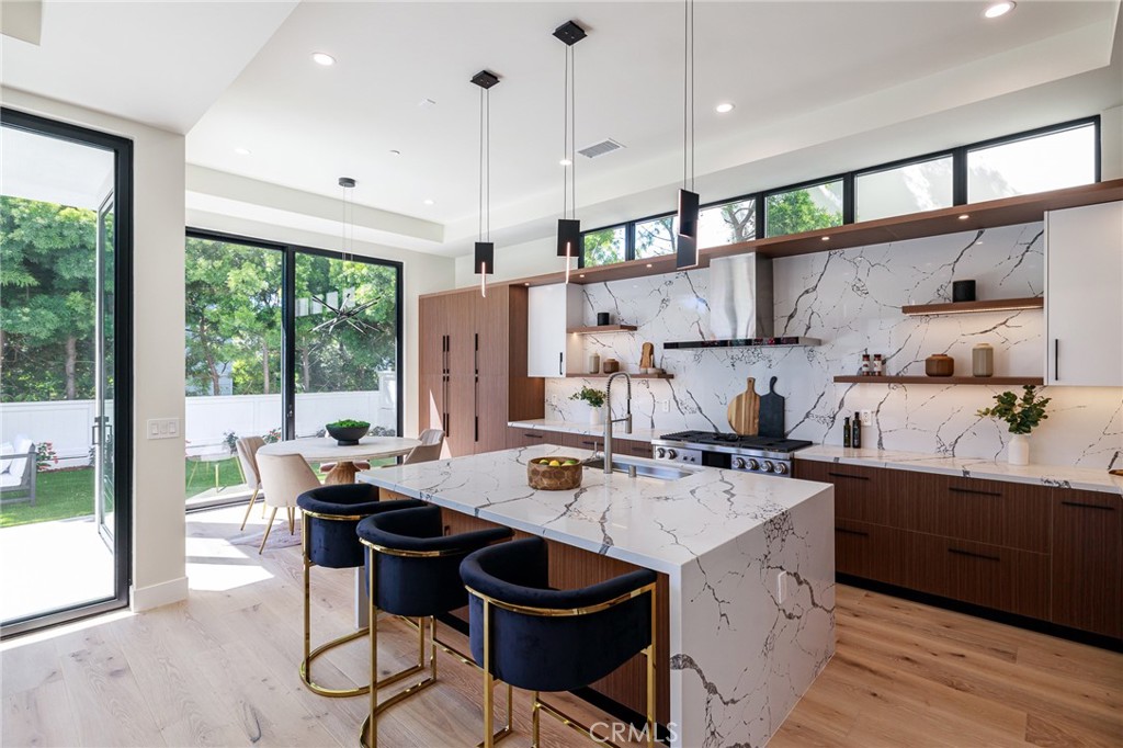 This home boasts two family rooms on the first level, both with fireplaces, separated by a stairway to the bedrooms and laundry above. White ash wood flooring throughout makes the transition from room to room visibly seamless. Loads of natural light filter through the over-sized windows. The Chef's kitchen is outfitted with Dacor appliances.
