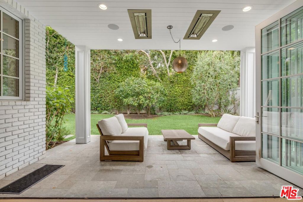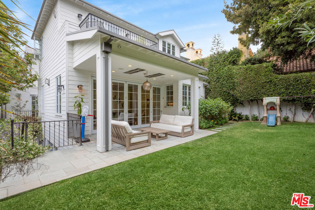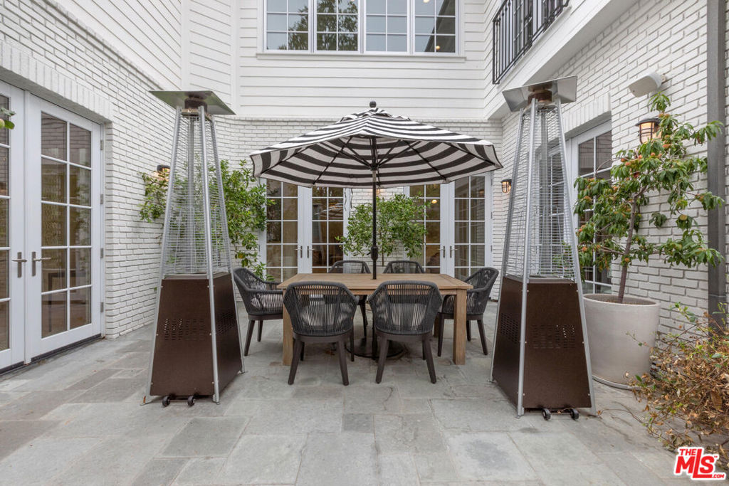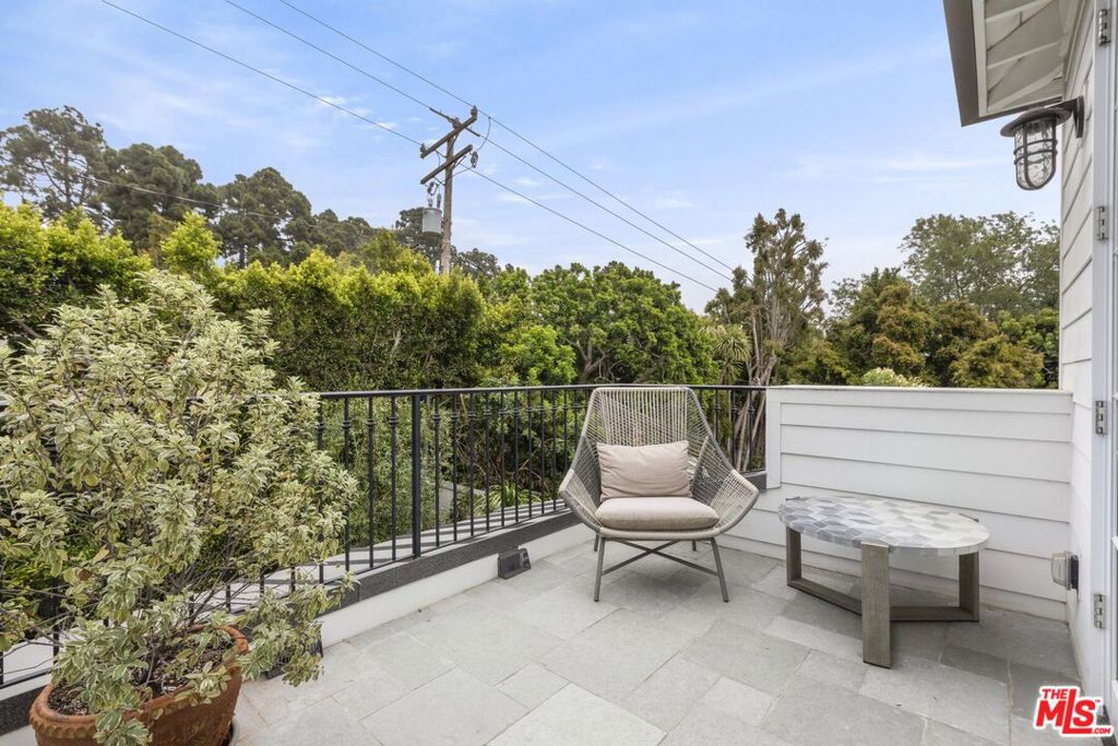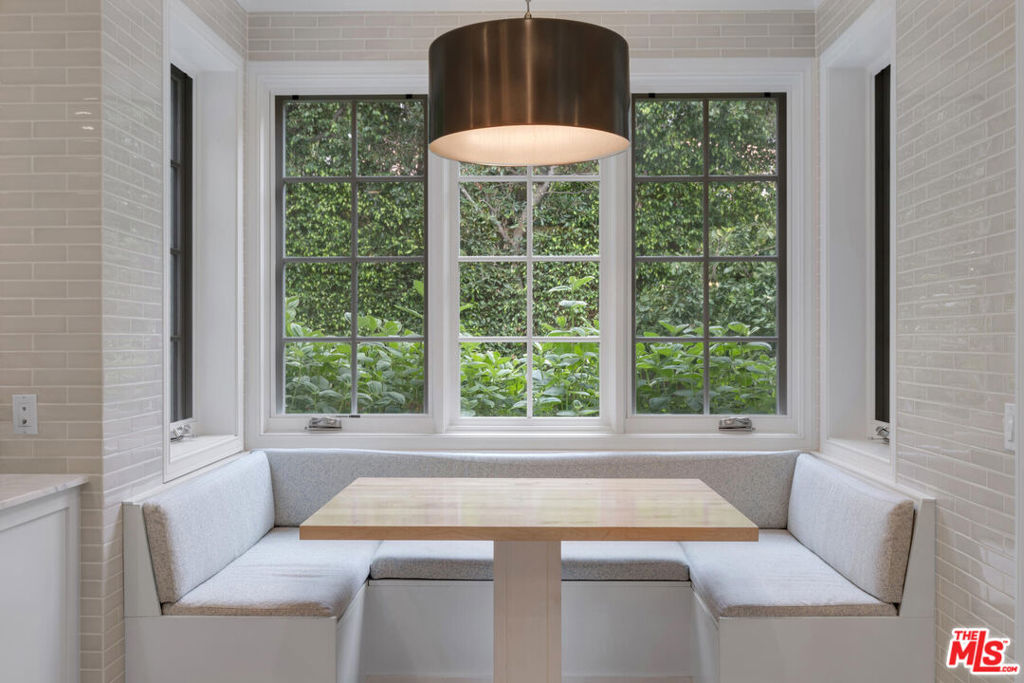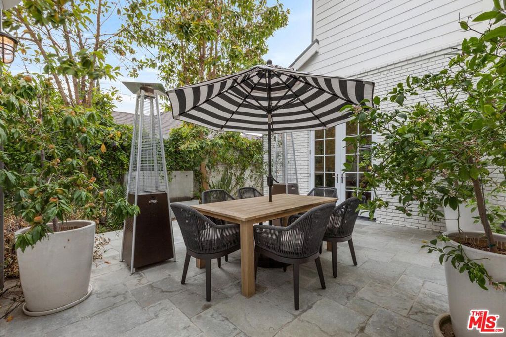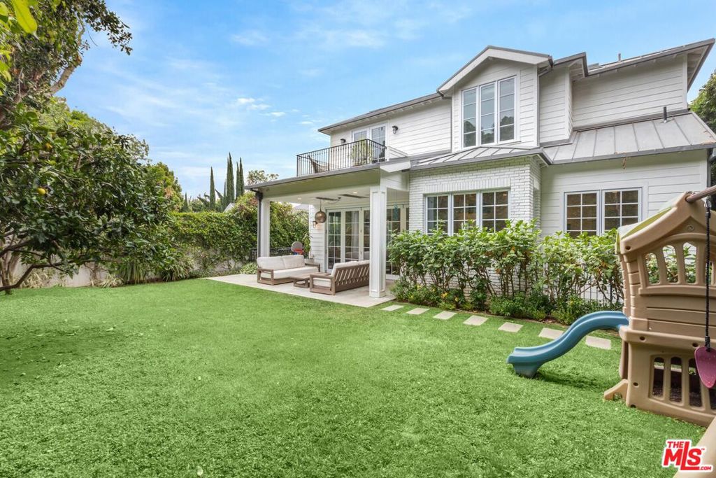 Charming White Brick Traditional built by John Andrews perched high above the street. Bright home filled with natural light, impressive ceiling height and volume and big windows capturing treetops and serene greenery. Beautiful wide plank Oak floors throughout. Stylish chefs kitchen with large island, Wolf Range, Sub Zero Refrigerator and charming built-in banquette overlooking the yard and garden. Covered patio with built-in heaters and speakers. Dining room with coffered ceilings opens to inviting court yard patio. This 3 level home has a theater/media room, en-suite guest bedroom and spacious laundry room on the lower level. Primary suite has a large custom walk-in closet and tasteful spa like bathroom with a stand a lone tub. 3 more bedrooms upstairs, plus an upstairs den on the landing with built-ins. Office downstairs with French doors opening to the court yard. Mature hedged yard with Multiple fruit trees. Large driveway and 2 car garage with Tesla charger and direct entry to mud room. Close to Brentwood Country Mart and Montana Shops.