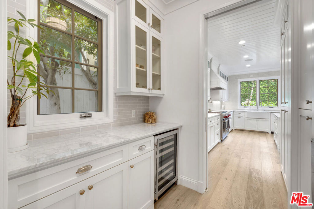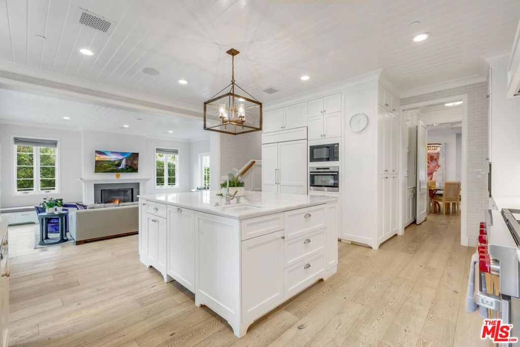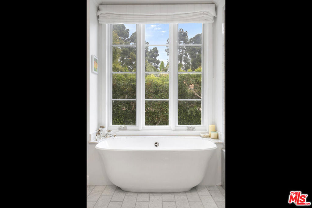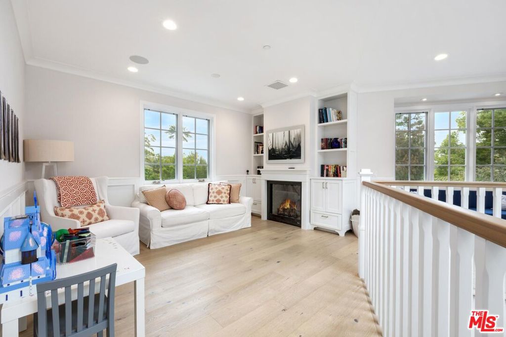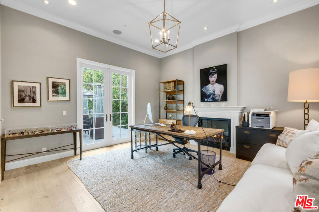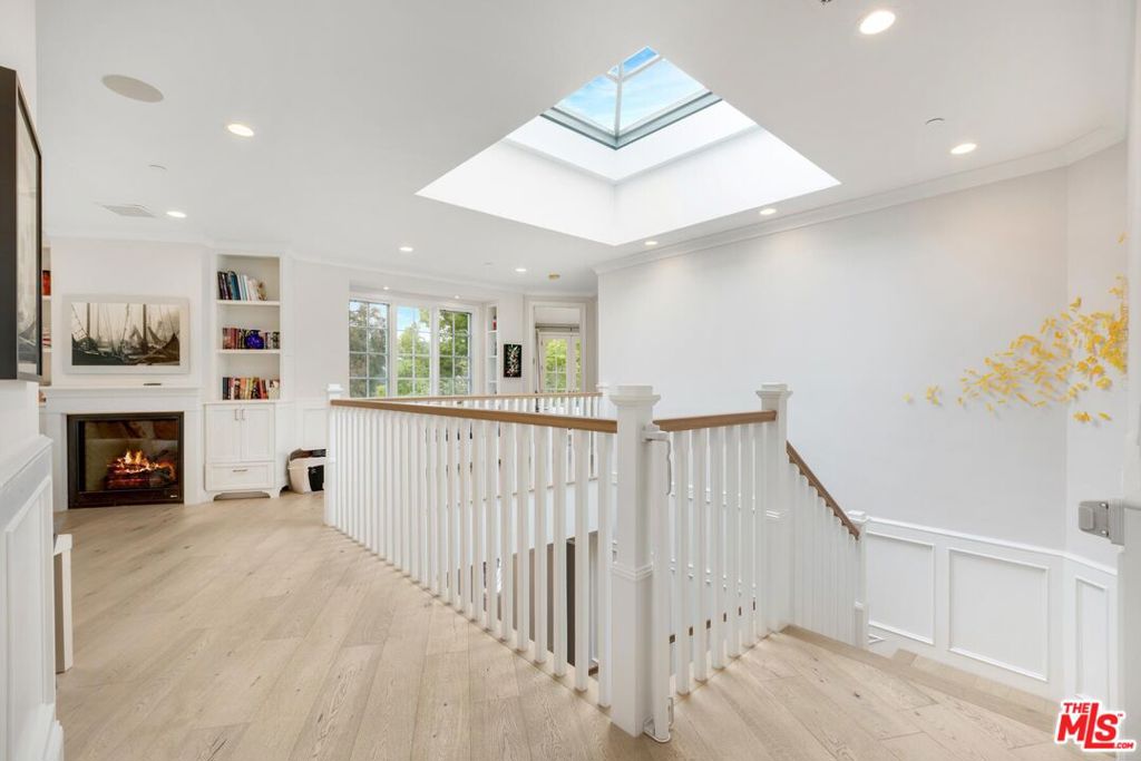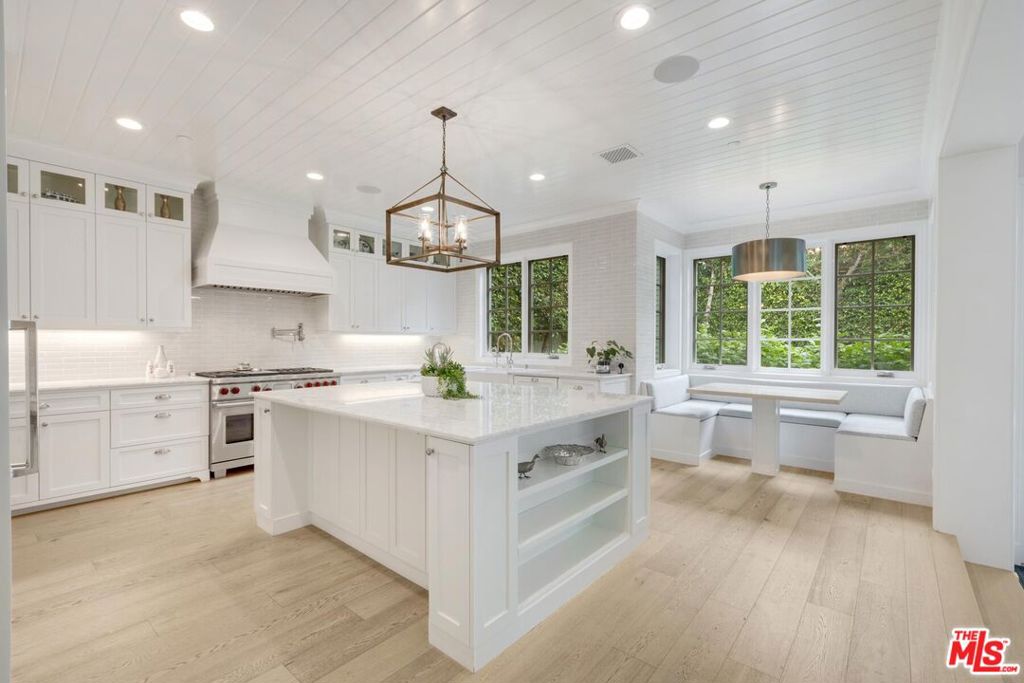 Charming White Brick Traditional built by John Andrews perched high above the street. Bright home filled with natural light, impressive ceiling height and volume and big windows capturing treetops and serene greenery. Beautiful wide plank Oak floors throughout. Stylish chefs kitchen with large island, Wolf Range, Sub Zero Refrigerator and charming built-in banquette overlooking the yard and garden. Covered patio with built-in heaters and speakers. Dining room with coffered ceilings opens to inviting court yard patio. This 3 level home has a theater/media room, en-suite guest bedroom and spacious laundry room on the lower level. Primary suite has a large custom walk-in closet and tasteful spa like bathroom with a stand a lone tub. 3 more bedrooms upstairs, plus an upstairs den on the landing with built-ins. Office downstairs with French doors opening to the court yard. Mature hedged yard with Multiple fruit trees. Large driveway and 2 car garage with Tesla charger and direct entry to mud room. Close to Brentwood Country Mart and Montana Shops.