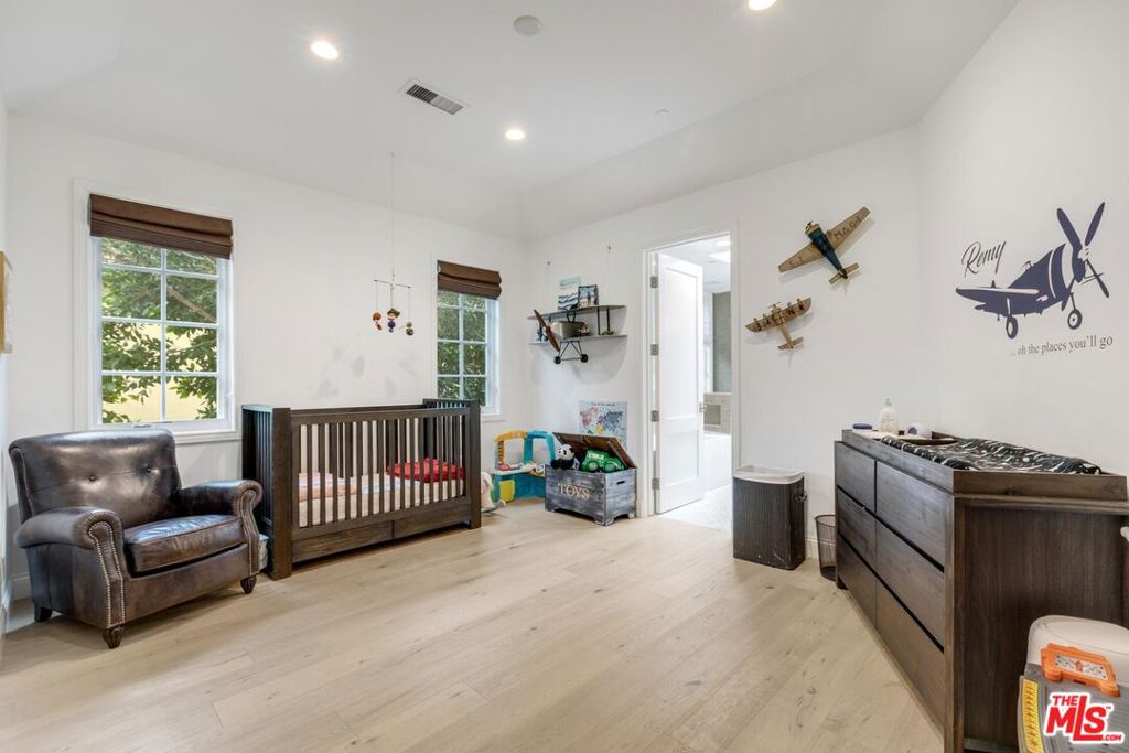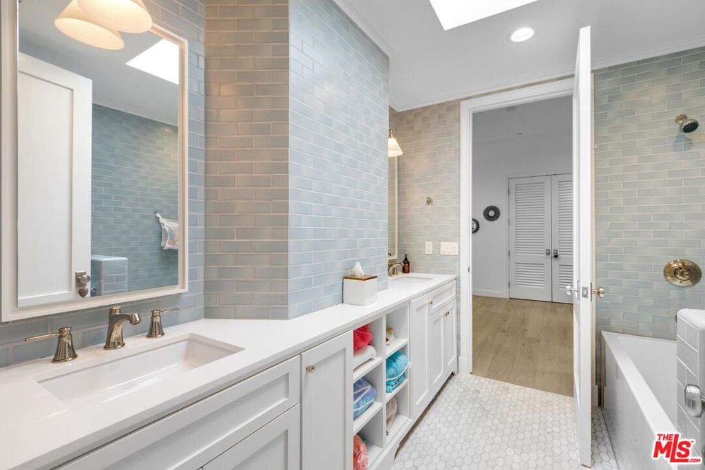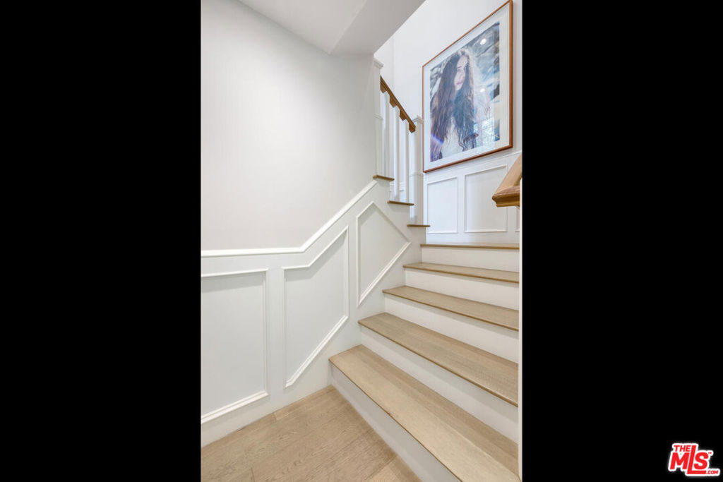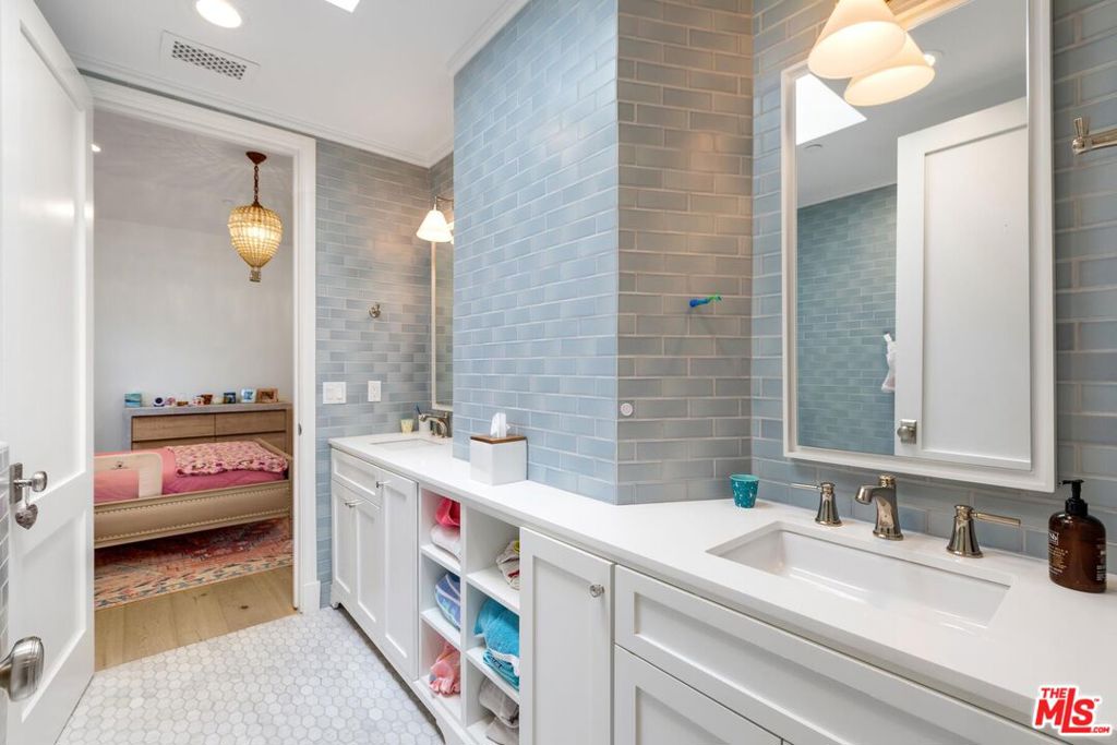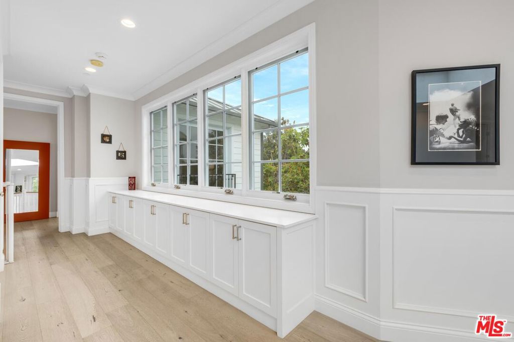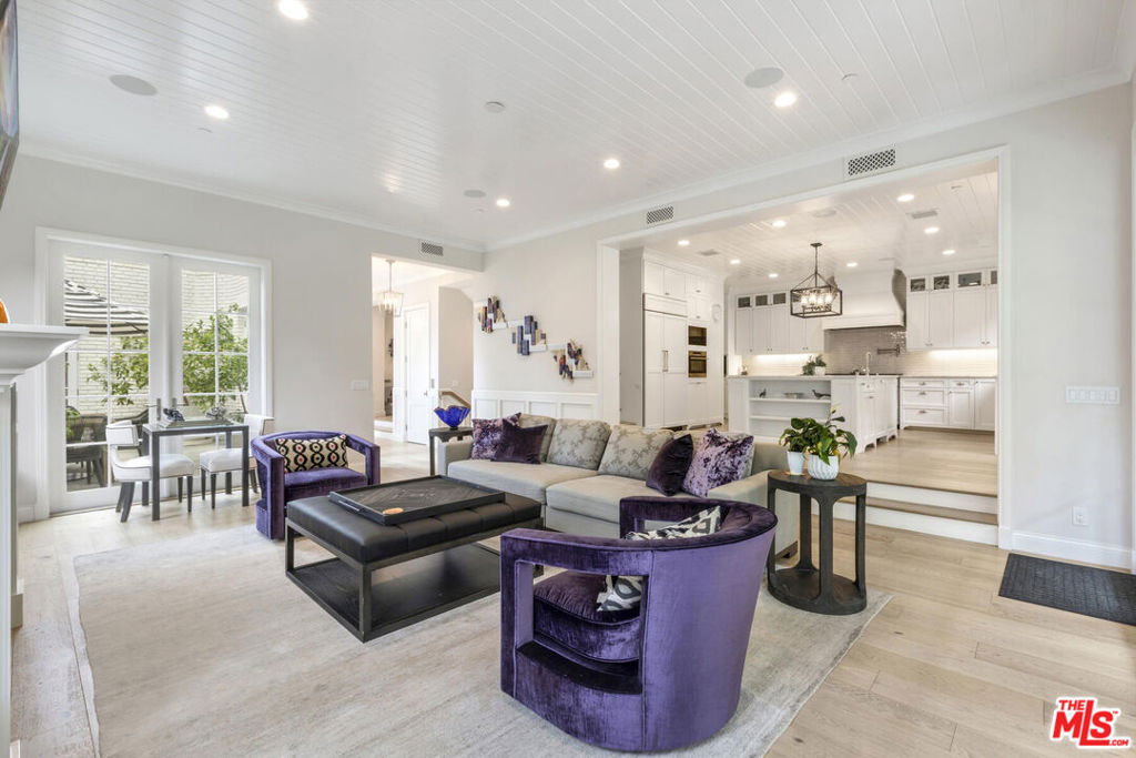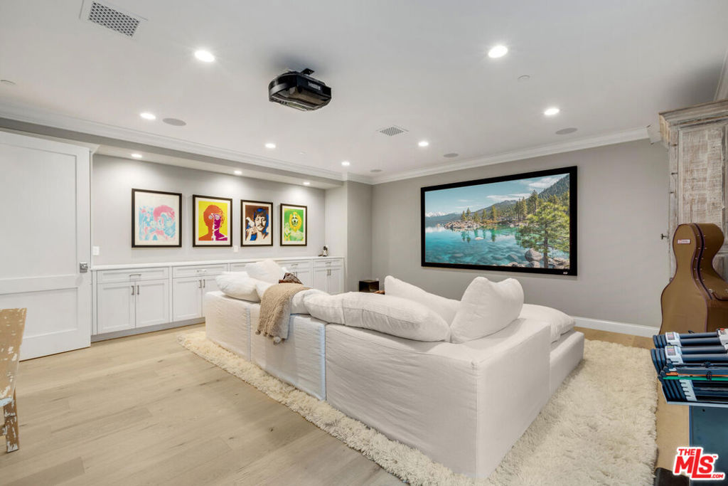 Charming White Brick Traditional built by John Andrews perched high above the street. Bright home filled with natural light, impressive ceiling height and volume and big windows capturing treetops and serene greenery. Beautiful wide plank Oak floors throughout. Stylish chefs kitchen with large island, Wolf Range, Sub Zero Refrigerator and charming built-in banquette overlooking the yard and garden. Covered patio with built-in heaters and speakers. Dining room with coffered ceilings opens to inviting court yard patio. This 3 level home has a theater/media room, en-suite guest bedroom and spacious laundry room on the lower level. Primary suite has a large custom walk-in closet and tasteful spa like bathroom with a stand a lone tub. 3 more bedrooms upstairs, plus an upstairs den on the landing with built-ins. Office downstairs with French doors opening to the court yard. Mature hedged yard with Multiple fruit trees. Large driveway and 2 car garage with Tesla charger and direct entry to mud room. Close to Brentwood Country Mart and Montana Shops.