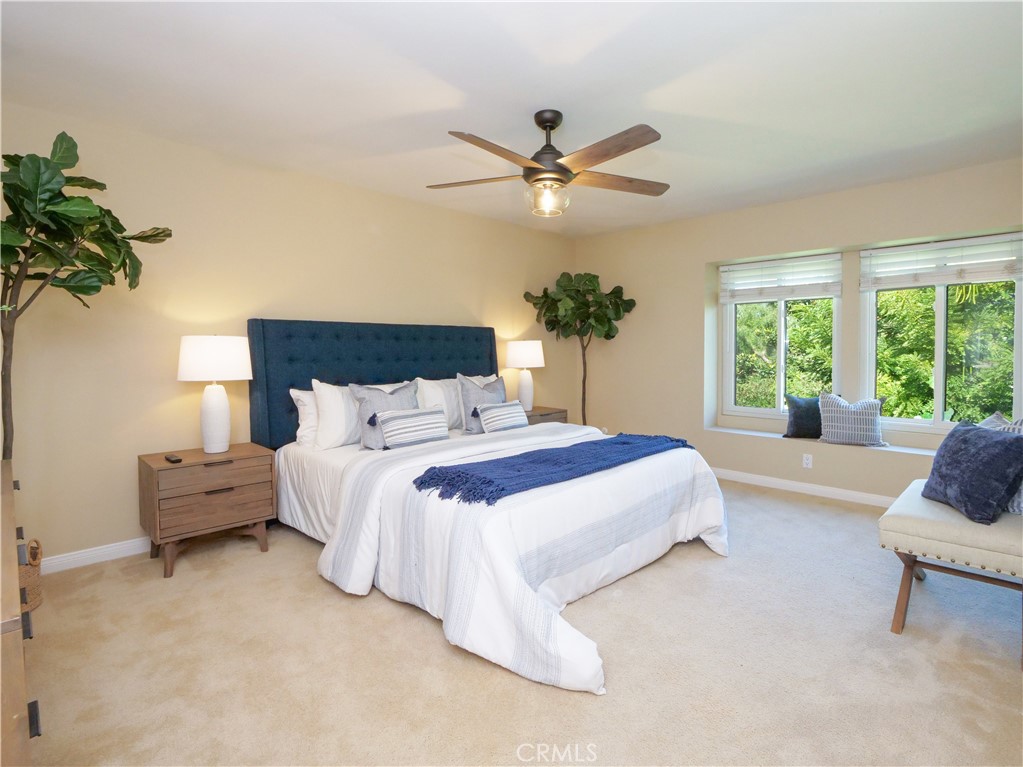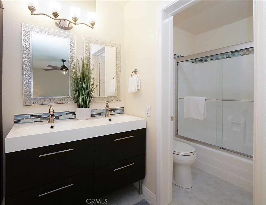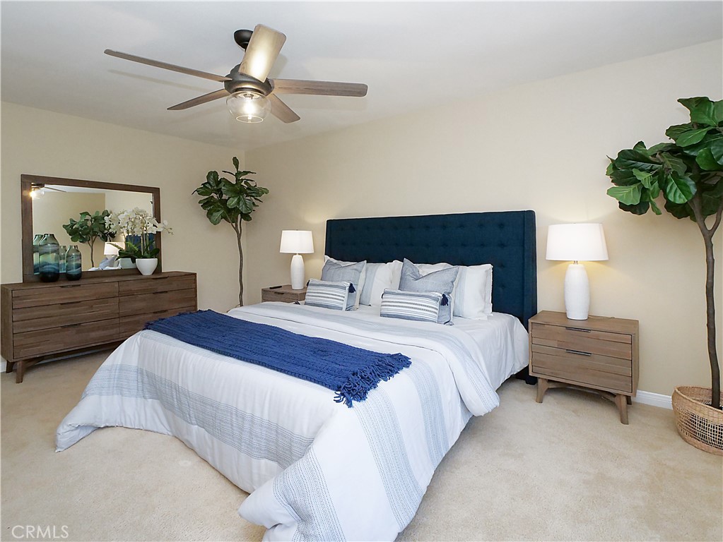 Welcome to this beautifully upgraded townhome located in the desirable community known as The Gardens. This stunning, move in ready unit offers 2 Master bedrooms, located upstairs each with their own private updated bathrooms. As you enter, you will surely note the fresh interior paint throughout, and the beautiful laminate flooring, as well as smooth ceiling, and recessed lighting. The spacious living room with elegant white plantation shutters offers great space for entertaining. As you continue through, you will find the open-concept dining/family room and a tastefully remodeled kitchen, featuring new kitchen cabinet and soft close drawer. The dining and kitchen area opens up to a delightful private patio.The expansive patio offers privacy and it has low maintenance landscaping. There are more upgrades which include, a built in hutch, double pane windows and slide, HVAC system. For your relaxation, enjoy the community pool and tennis courts in this resort style community. It is so convenient to shops and good access to the 110 freeway. Beautiful home, lush surrounding, great location, convenient access. This unit has it all!