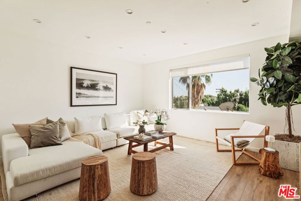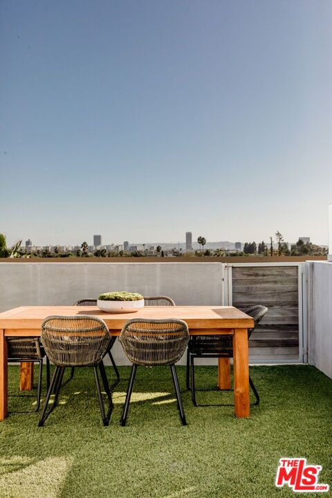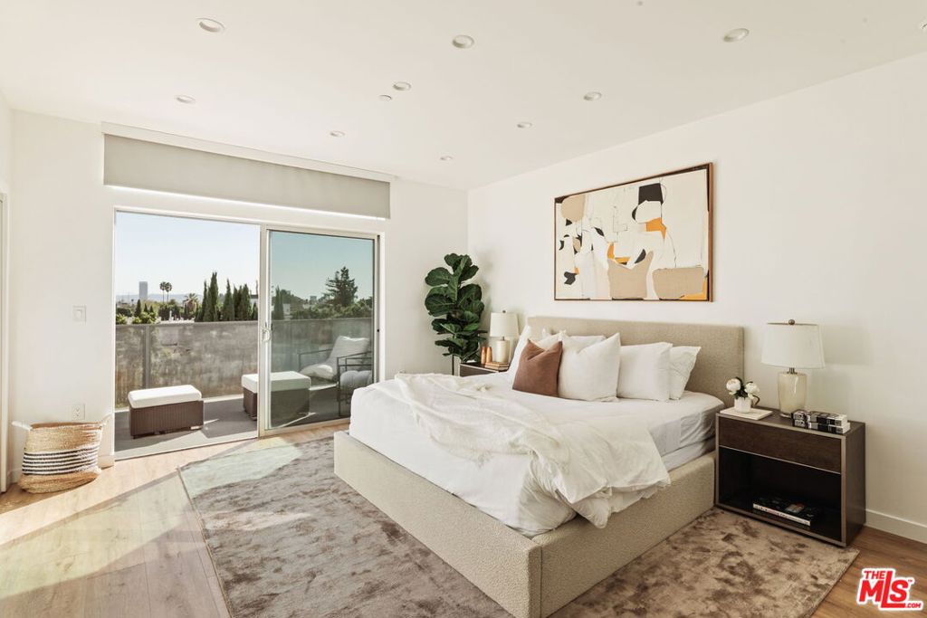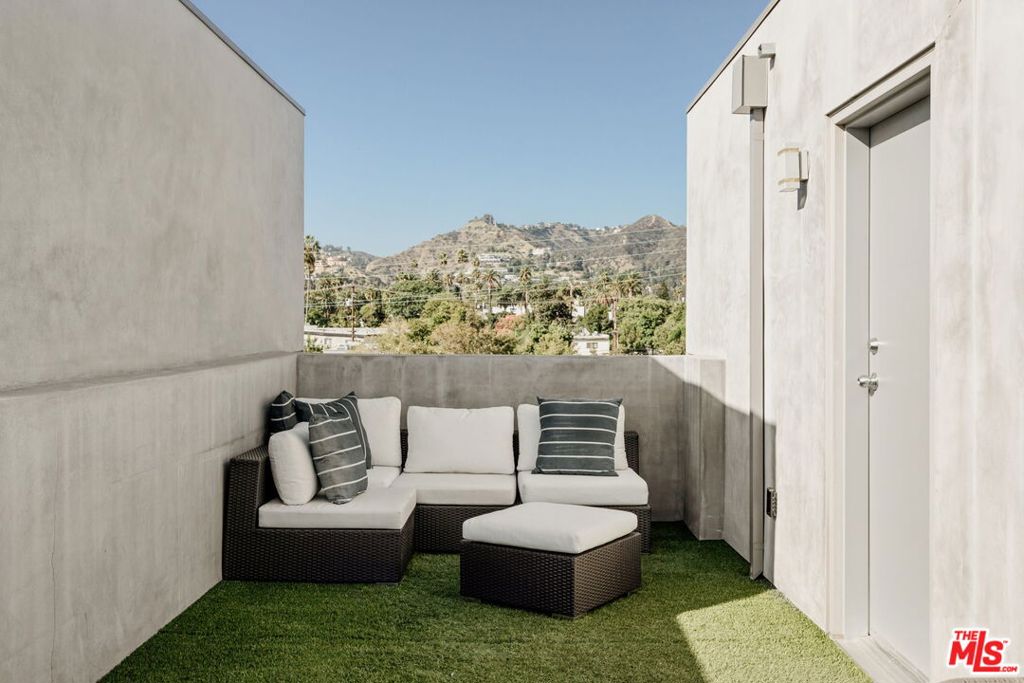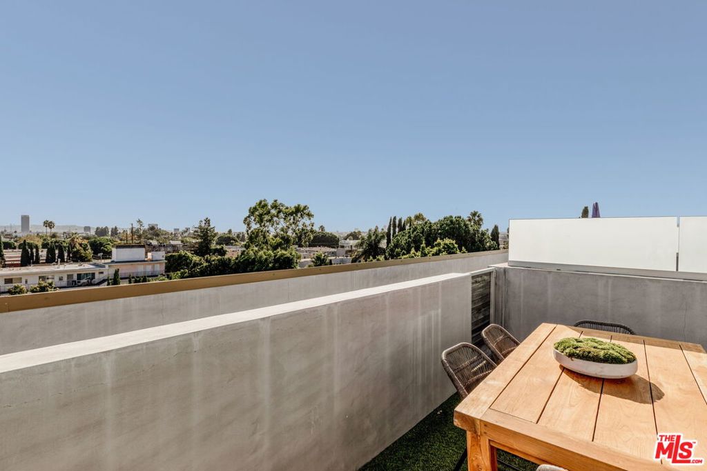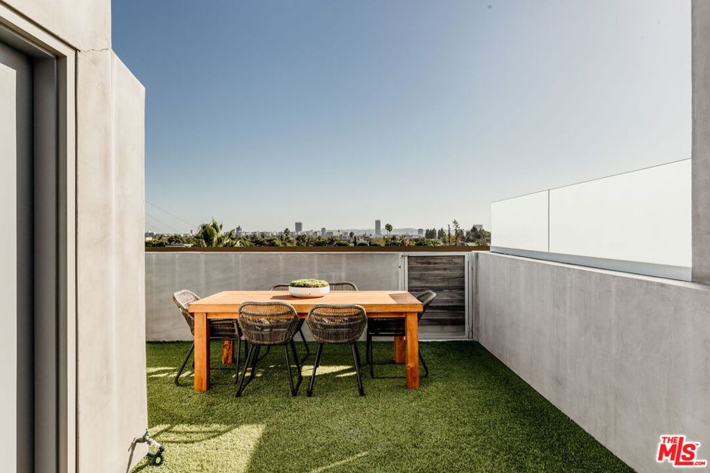 Surrounded by the best that West Hollywood has to offer between Melrose Ave and Santa Monica Blvd sits this beautiful modern townhouse. Through the front door, a long hallway leads past two guest bedrooms with a jack and jill bathroom to a staircase. With an abundance of natural light, the second level boasts a large open living space featuring a great room with city views, a gourmet kitchen with high end appliances, built-ins, a breakfast bar and dining area. On the third level you will find the primary bedroom showcasing custom closets and a private balcony with expansive city views. The primary bathroom includes a standing shower, bath tub, and dual sink vanity. Revel in panoramic views of the Hollywood Hills and Downtown from the private rooftop. For ultimate convenience, the unit includes laundry, two assigned tandem parking spaces, a bike rack, and additional storage.
