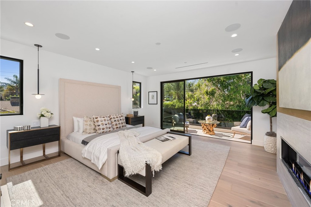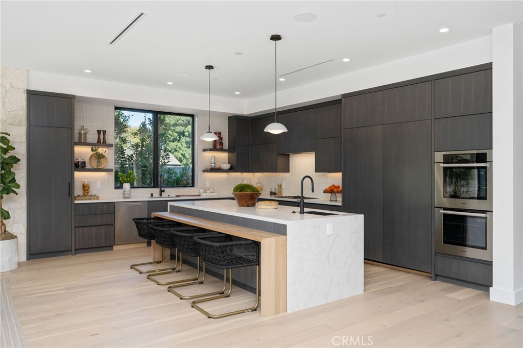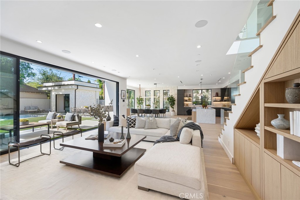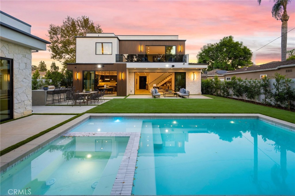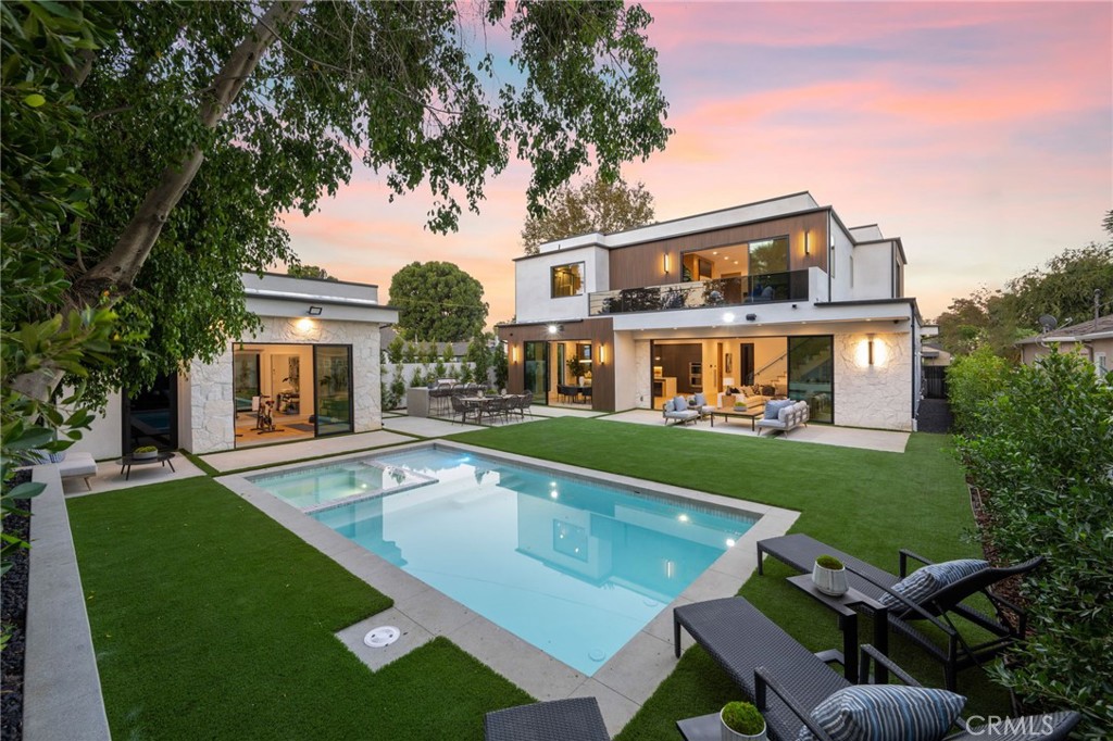 Masterfully Designed Contemporary New Construction estate perfectly located within a terrific Sherman Oaks location, just minutes from Ventura Blvd and the Valley's best shops/restaurants. This Luxurious smart home elegantly incorporates unrivaled craftsmanship within the bold modern design. Spanning across over 4,000 sqft of luxurious living space and displaying an open floor plan with an abundance of natural light throughout. Sleek chefs kitchen equipped with top-of-the line appliances, large island with nook seating and custom cabinetry. Designer primary bedroom with fireplace, large balcony and large walk-in closet space. Indulging master bathroom boasts a relaxing soaking tub, double vanities and walk-in shower. Floor to ceiling glass pocket doors lead to the oasis like backyard featuring a patio for outdoor dining, BBQ with bar seating, pool house with shower & bath, sparkling pool/spa and a large grassy area. Additional amenities include security system with cameras/intercom, solar system, EV charging port and surround sound system throughout.