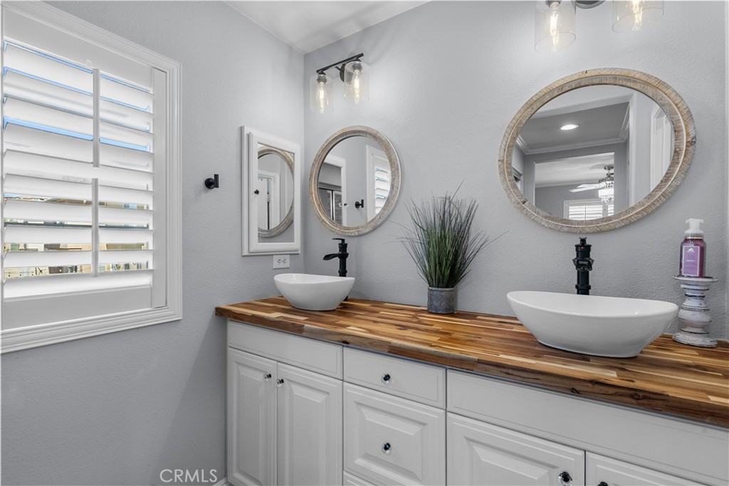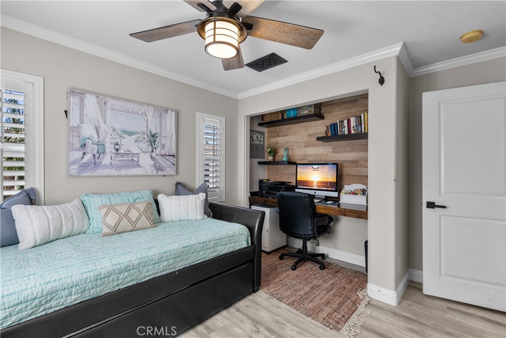 The master bedroom is a sanctuary of style, featuring a decorative wall that adds a touch of artistic flair to the space. Plantation shutters adorn the windows, allowing for both privacy and natural light to filter through, while the modern lighting fixtures throughout the home create a chic and inviting atmosphere.