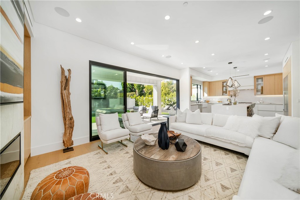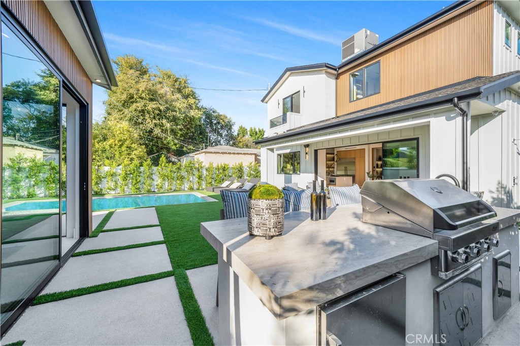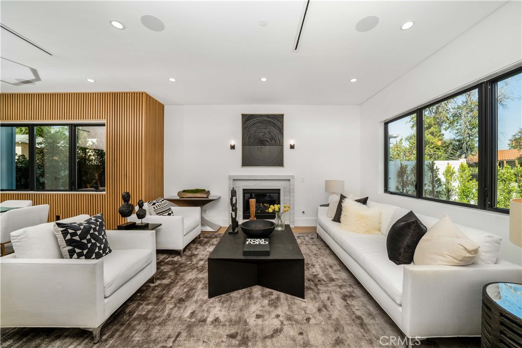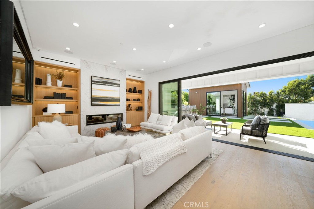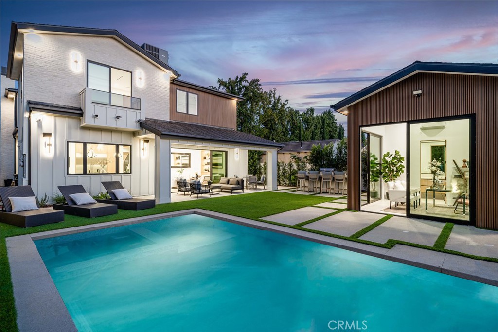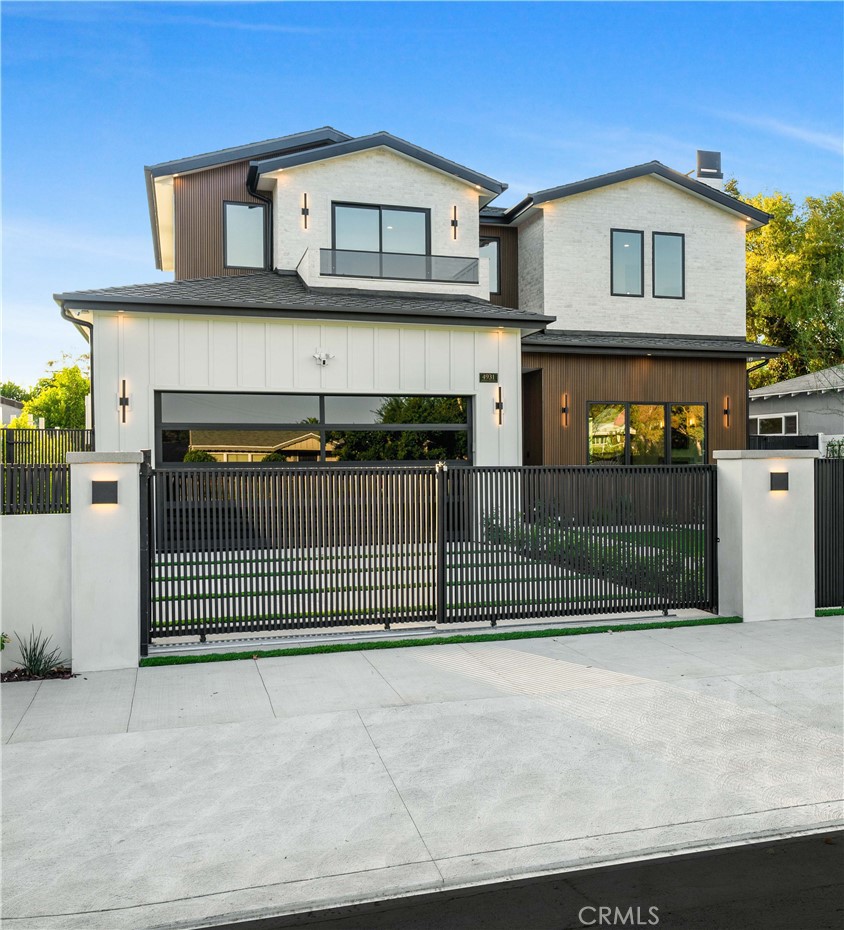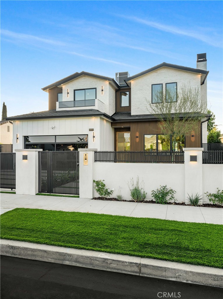 New transitional home on a gated lot in prime Sherman Oaks, with modern flair. Featuring 5 BR – 6 BA in home and detached rec room with approximately 3,600 sqft on an over 7,000 sqft lot. Bright living room with fireplace opens to dining room with white oak accent wall. Gourmet kitchen features stainless-steel appliances, custom cabinetry, center island with bar seating, and walk-in pantry. Kitchen opens to family room with custom built-ins with accent lighting, electric fireplace with bookmatch porcelain mantle wall, and sliding glass doors to covered patio. Backyard features spacious turfed area, detached rec room with half bath and HVAC, saltwater pool/spa with waterfall, BBQ area with bar seating, and exterior pool shower. Primary suite features electric fireplace with porcelain mantle, balcony, walk-in closet with accent lighting, and primary bath with built-ins, shower with porcelain tilework, and soaking tub. Home is completed by entertainer/designer details such as custom woodwork/tilework, spacious upstairs patio, surround sound speakers, landscape lighting, solar panels, security system with alarm/cameras, and Control 4 smart home system.