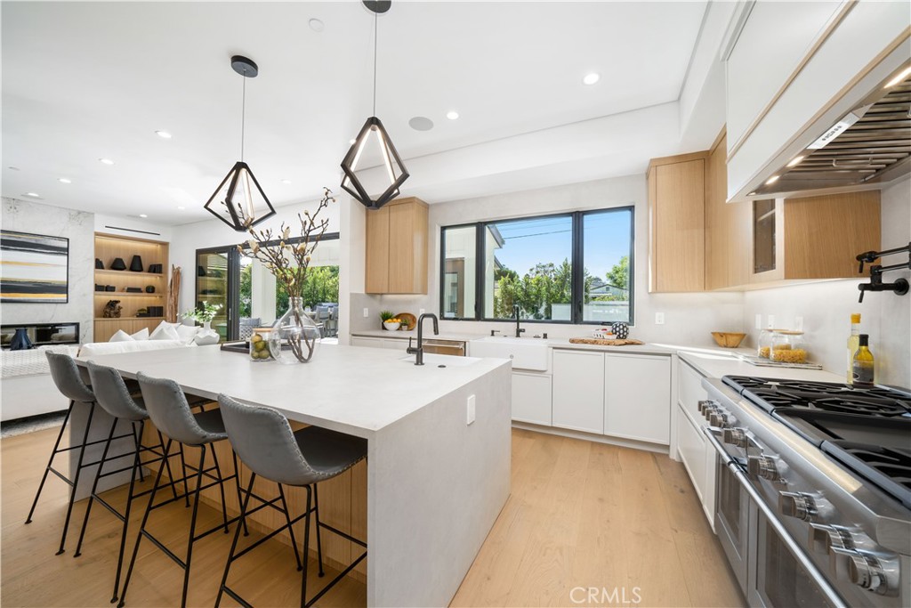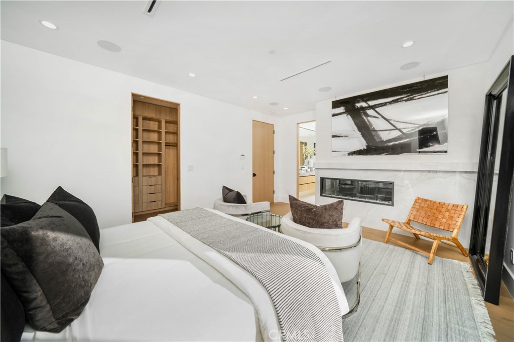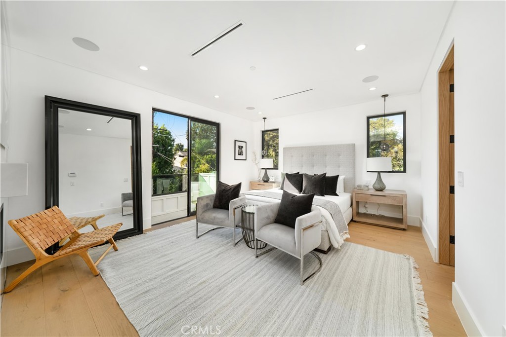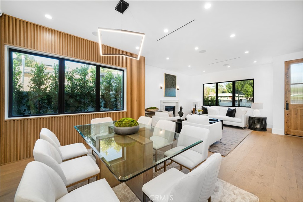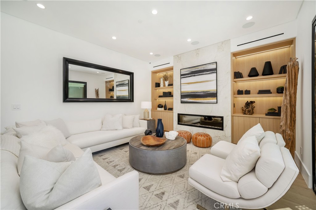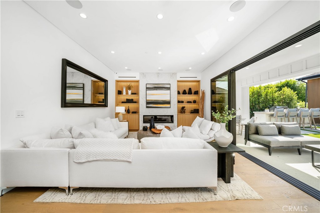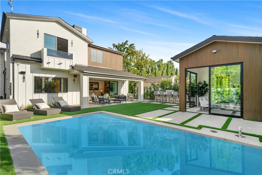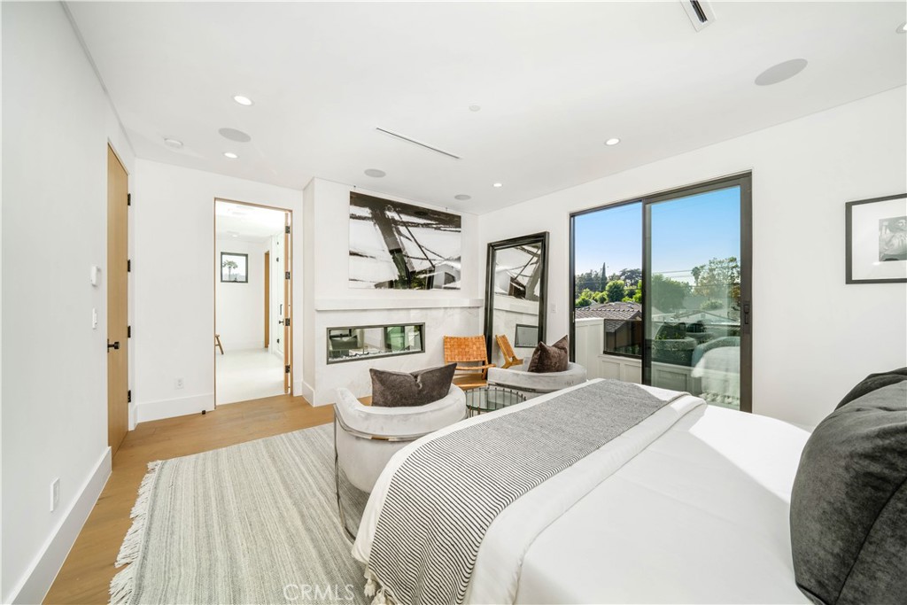 New transitional home on a gated lot in prime Sherman Oaks, with modern flair. Featuring 5 BR – 6 BA in home and detached rec room with approximately 3,600 sqft on an over 7,000 sqft lot. Bright living room with fireplace opens to dining room with white oak accent wall. Gourmet kitchen features stainless-steel appliances, custom cabinetry, center island with bar seating, and walk-in pantry. Kitchen opens to family room with custom built-ins with accent lighting, electric fireplace with bookmatch porcelain mantle wall, and sliding glass doors to covered patio. Backyard features spacious turfed area, detached rec room with half bath and HVAC, saltwater pool/spa with waterfall, BBQ area with bar seating, and exterior pool shower. Primary suite features electric fireplace with porcelain mantle, balcony, walk-in closet with accent lighting, and primary bath with built-ins, shower with porcelain tilework, and soaking tub. Home is completed by entertainer/designer details such as custom woodwork/tilework, spacious upstairs patio, surround sound speakers, landscape lighting, solar panels, security system with alarm/cameras, and Control 4 smart home system.