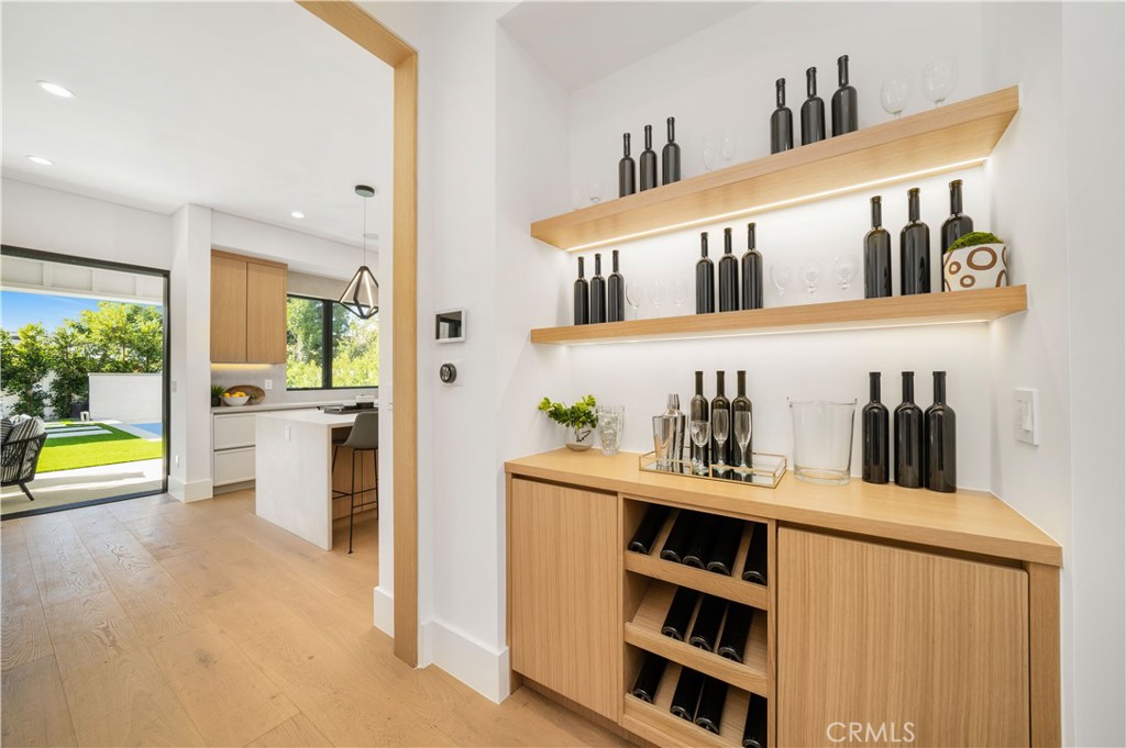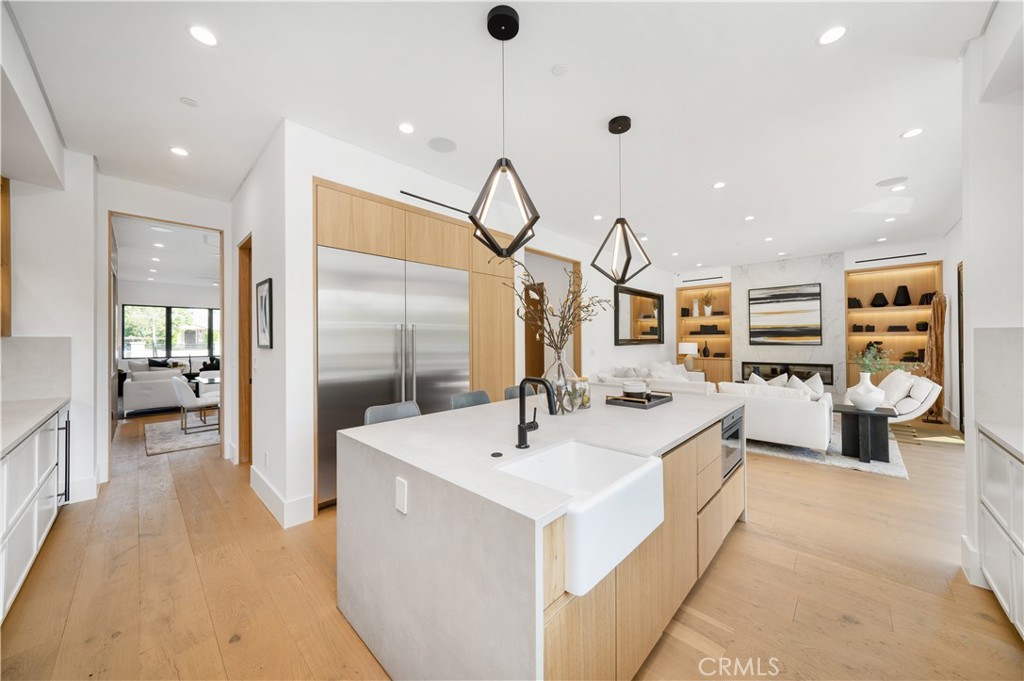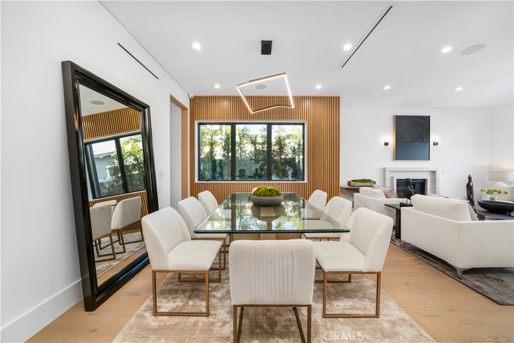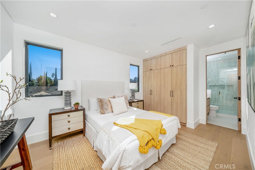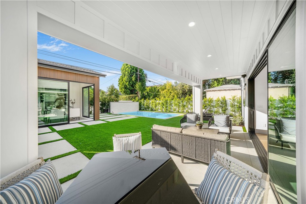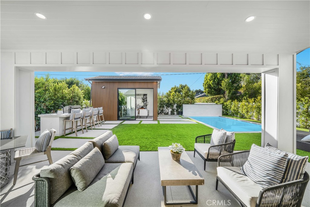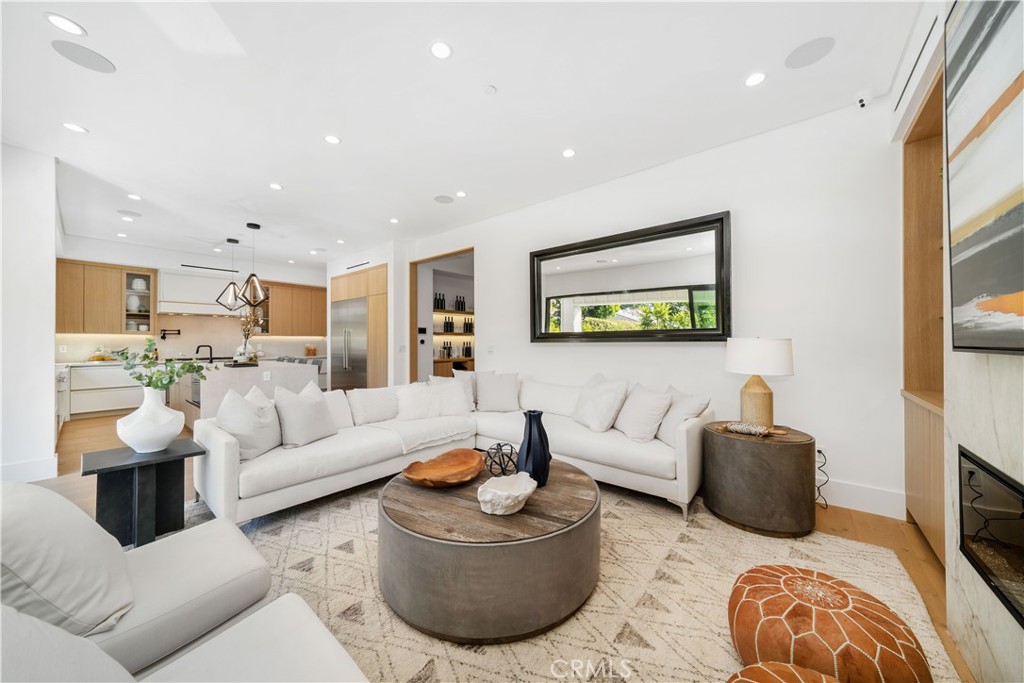 New transitional home on a gated lot in prime Sherman Oaks, with modern flair. Featuring 5 BR – 6 BA in home and detached rec room with approximately 3,600 sqft on an over 7,000 sqft lot. Bright living room with fireplace opens to dining room with white oak accent wall. Gourmet kitchen features stainless-steel appliances, custom cabinetry, center island with bar seating, and walk-in pantry. Kitchen opens to family room with custom built-ins with accent lighting, electric fireplace with bookmatch porcelain mantle wall, and sliding glass doors to covered patio. Backyard features spacious turfed area, detached rec room with half bath and HVAC, saltwater pool/spa with waterfall, BBQ area with bar seating, and exterior pool shower. Primary suite features electric fireplace with porcelain mantle, balcony, walk-in closet with accent lighting, and primary bath with built-ins, shower with porcelain tilework, and soaking tub. Home is completed by entertainer/designer details such as custom woodwork/tilework, spacious upstairs patio, surround sound speakers, landscape lighting, solar panels, security system with alarm/cameras, and Control 4 smart home system.