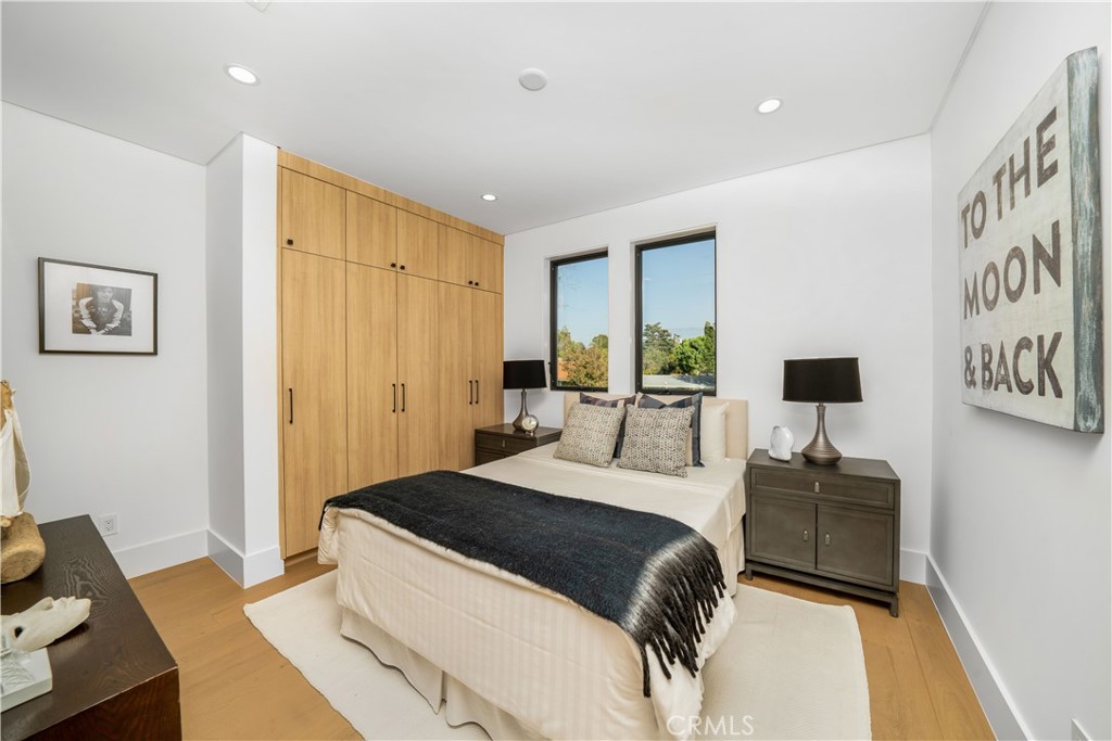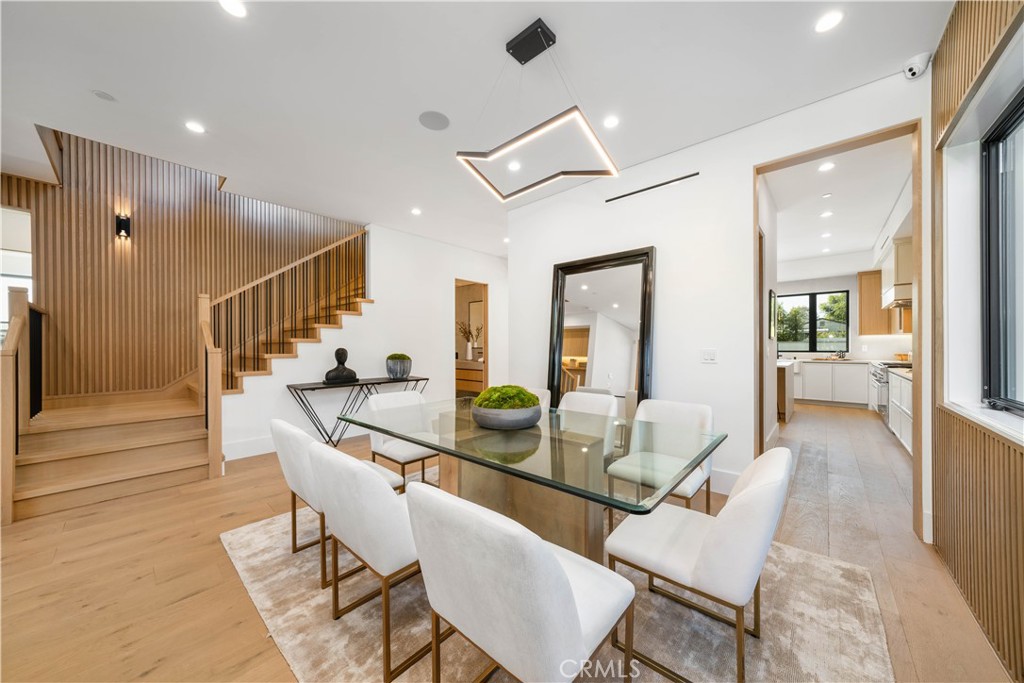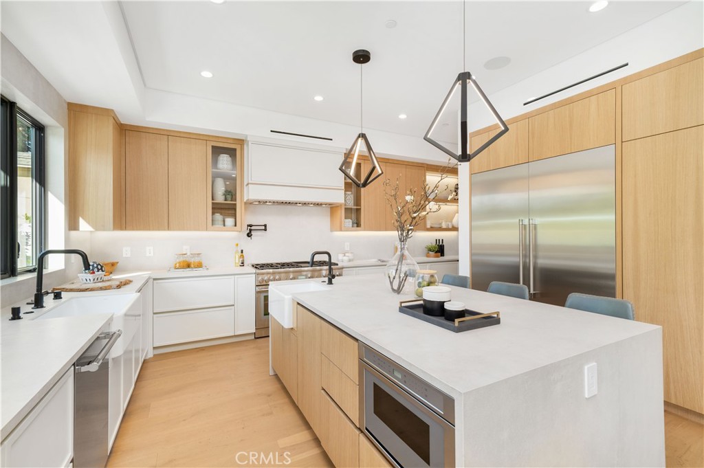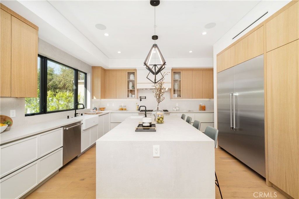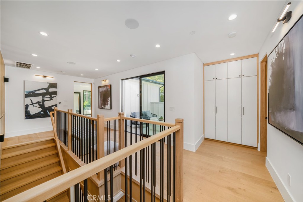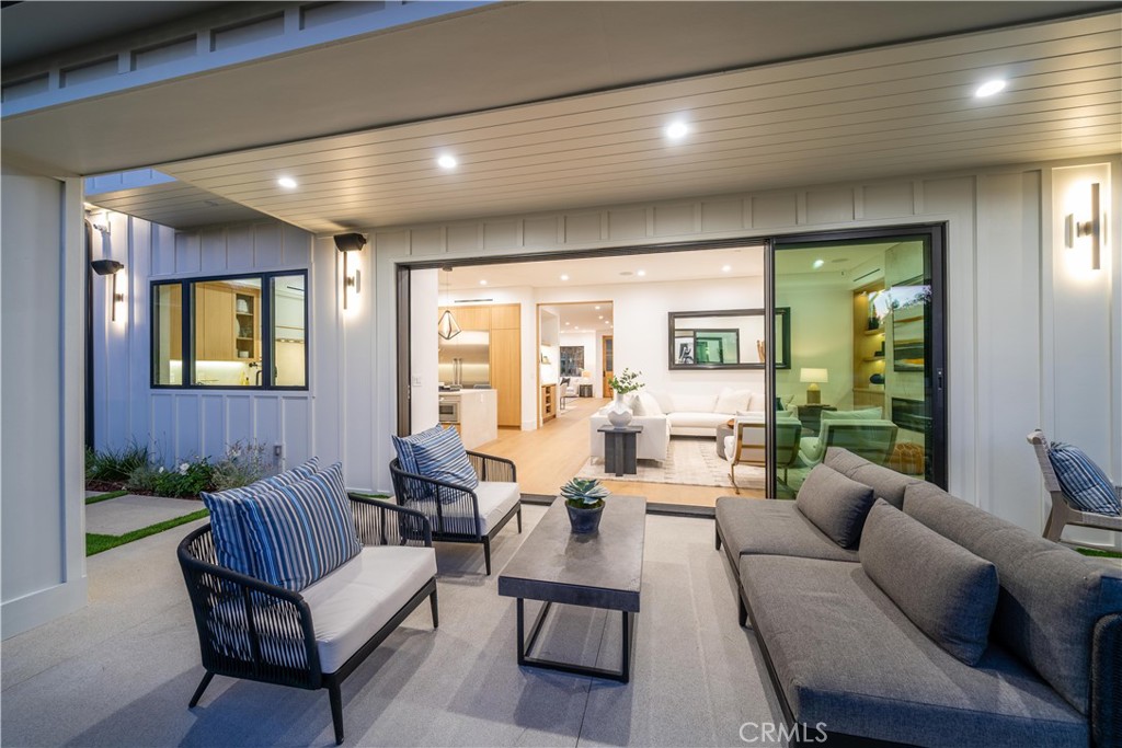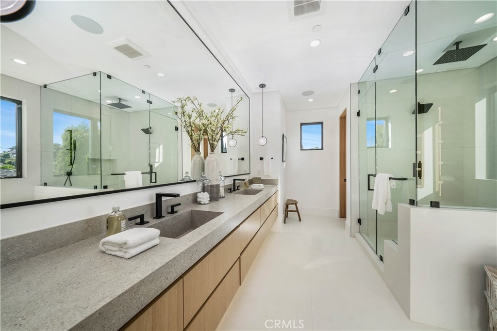 New transitional home on a gated lot in prime Sherman Oaks, with modern flair. Featuring 5 BR – 6 BA in home and detached rec room with approximately 3,600 sqft on an over 7,000 sqft lot. Bright living room with fireplace opens to dining room with white oak accent wall. Gourmet kitchen features stainless-steel appliances, custom cabinetry, center island with bar seating, and walk-in pantry. Kitchen opens to family room with custom built-ins with accent lighting, electric fireplace with bookmatch porcelain mantle wall, and sliding glass doors to covered patio. Backyard features spacious turfed area, detached rec room with half bath and HVAC, saltwater pool/spa with waterfall, BBQ area with bar seating, and exterior pool shower. Primary suite features electric fireplace with porcelain mantle, balcony, walk-in closet with accent lighting, and primary bath with built-ins, shower with porcelain tilework, and soaking tub. Home is completed by entertainer/designer details such as custom woodwork/tilework, spacious upstairs patio, surround sound speakers, landscape lighting, solar panels, security system with alarm/cameras, and Control 4 smart home system.