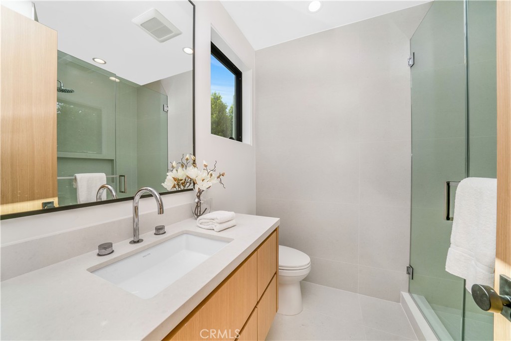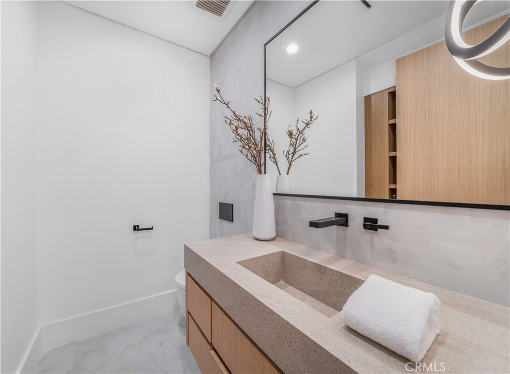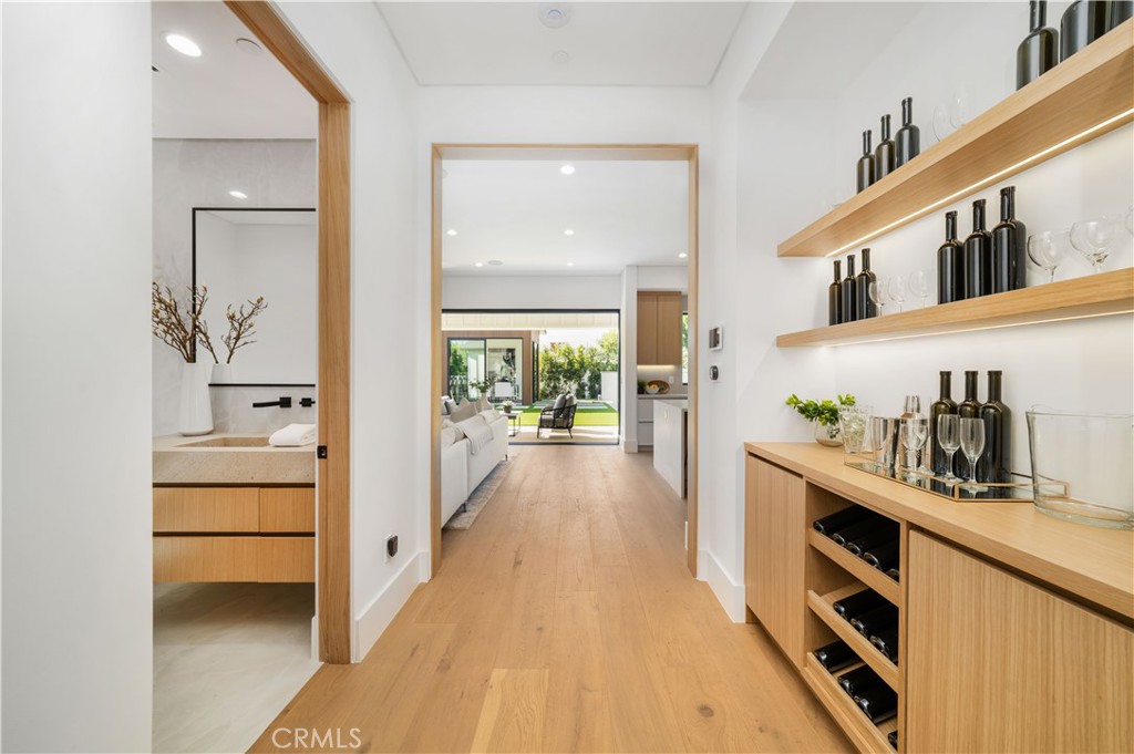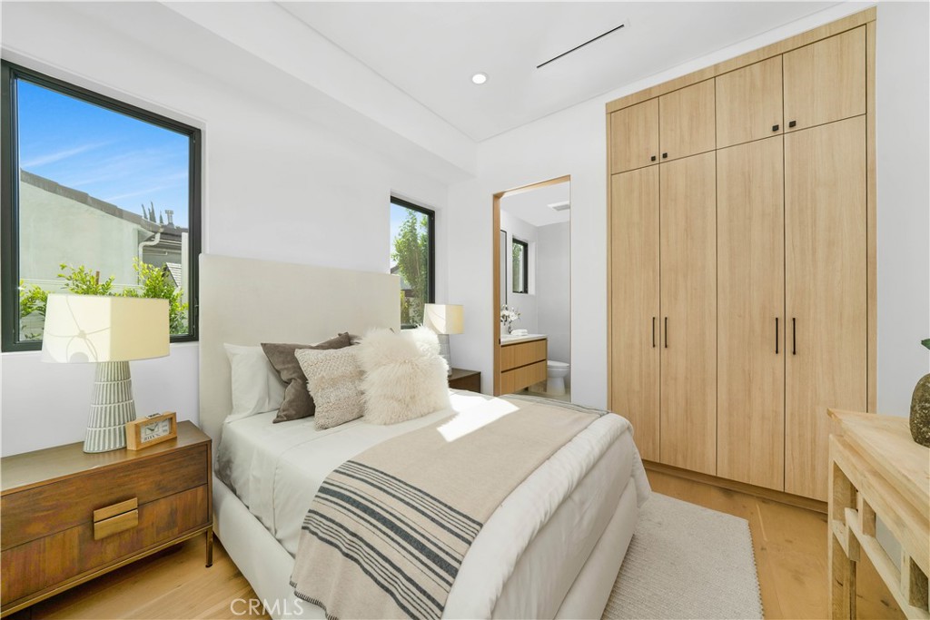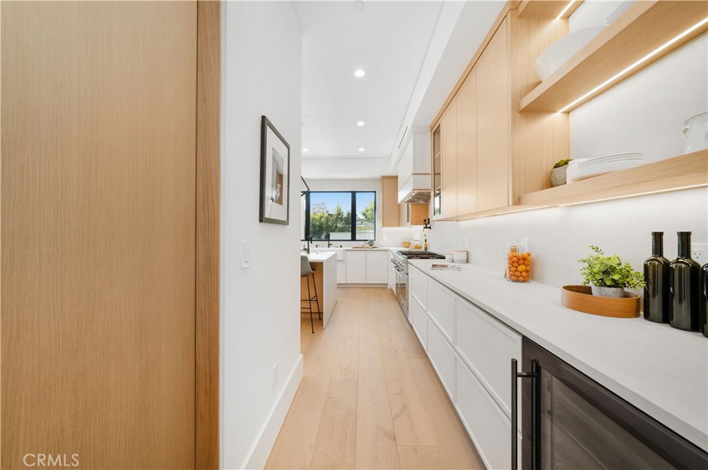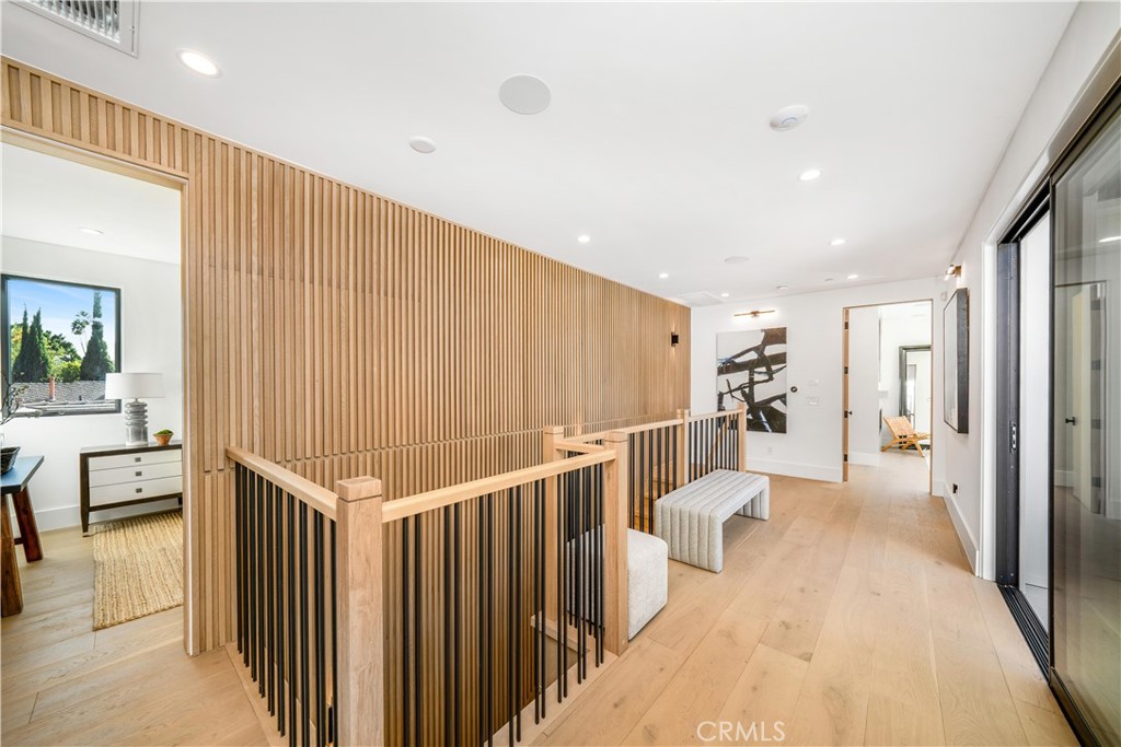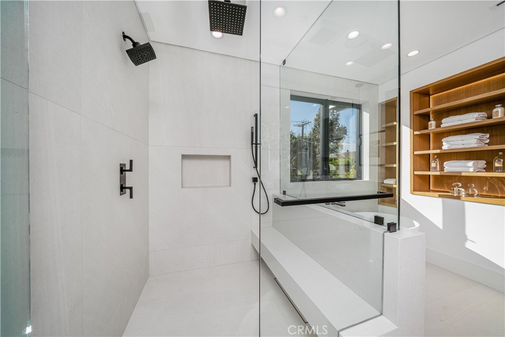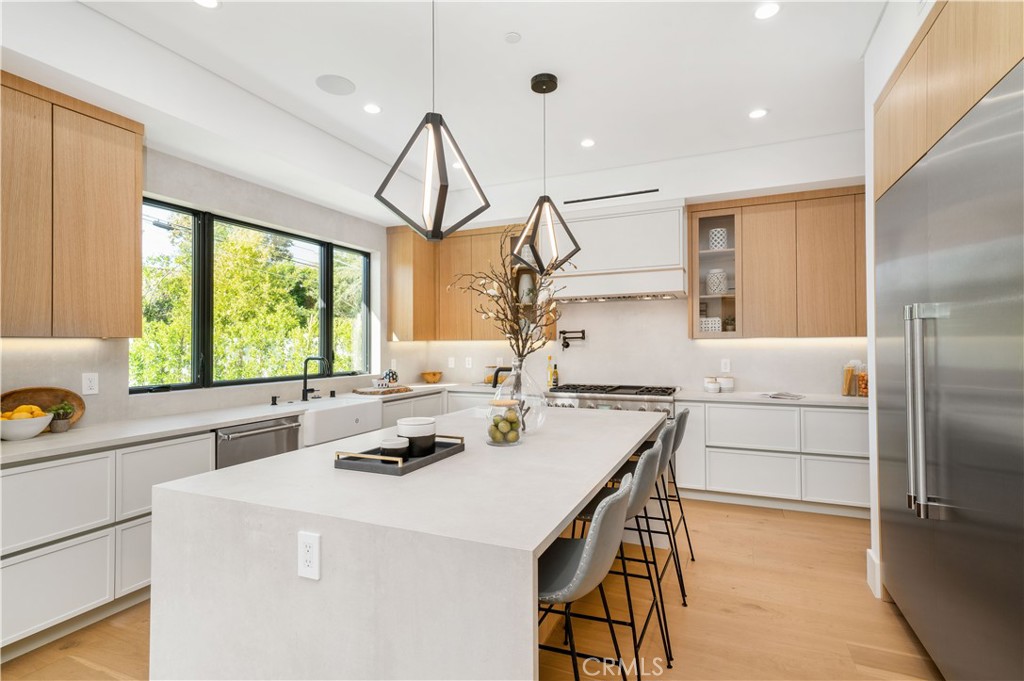 New transitional home on a gated lot in prime Sherman Oaks, with modern flair. Featuring 5 BR – 6 BA in home and detached rec room with approximately 3,600 sqft on an over 7,000 sqft lot. Bright living room with fireplace opens to dining room with white oak accent wall. Gourmet kitchen features stainless-steel appliances, custom cabinetry, center island with bar seating, and walk-in pantry. Kitchen opens to family room with custom built-ins with accent lighting, electric fireplace with bookmatch porcelain mantle wall, and sliding glass doors to covered patio. Backyard features spacious turfed area, detached rec room with half bath and HVAC, saltwater pool/spa with waterfall, BBQ area with bar seating, and exterior pool shower. Primary suite features electric fireplace with porcelain mantle, balcony, walk-in closet with accent lighting, and primary bath with built-ins, shower with porcelain tilework, and soaking tub. Home is completed by entertainer/designer details such as custom woodwork/tilework, spacious upstairs patio, surround sound speakers, landscape lighting, solar panels, security system with alarm/cameras, and Control 4 smart home system.