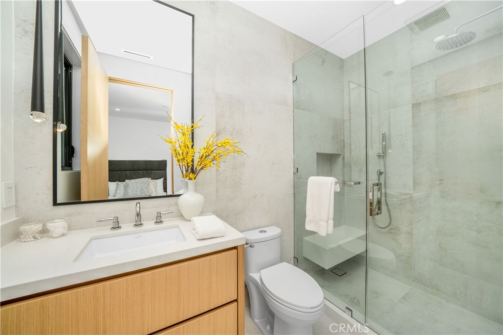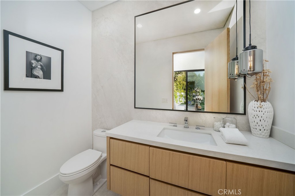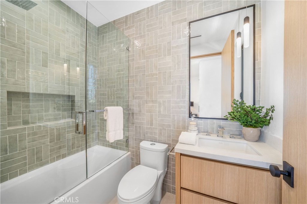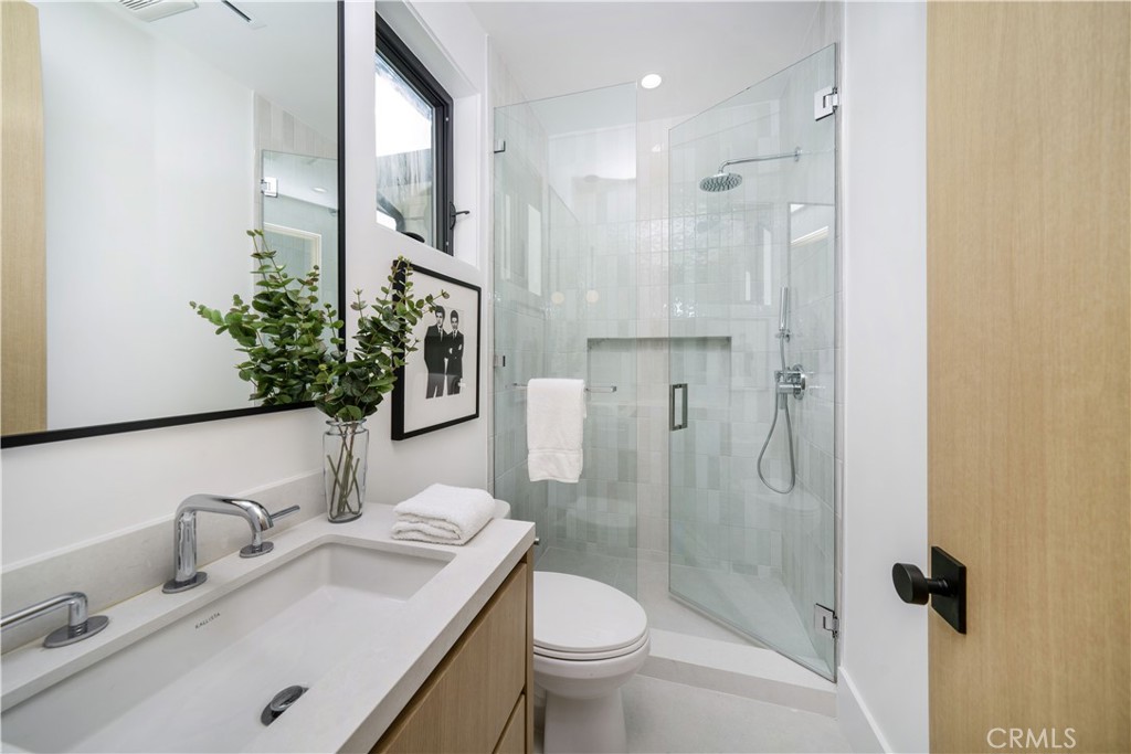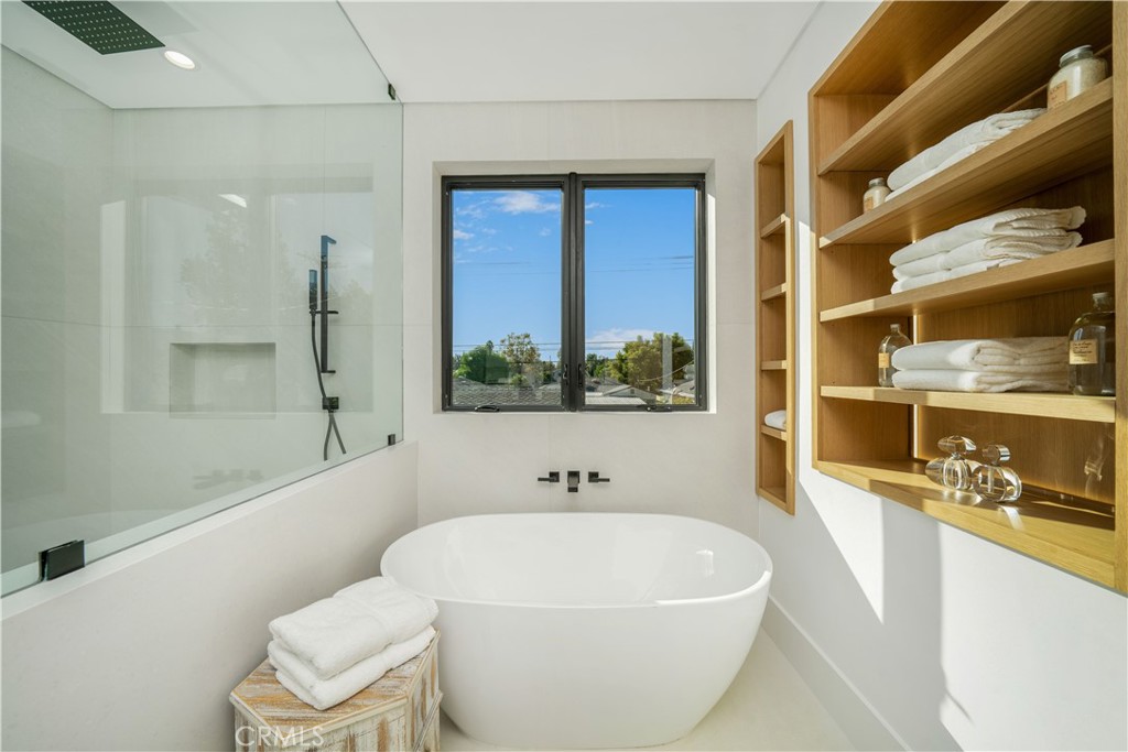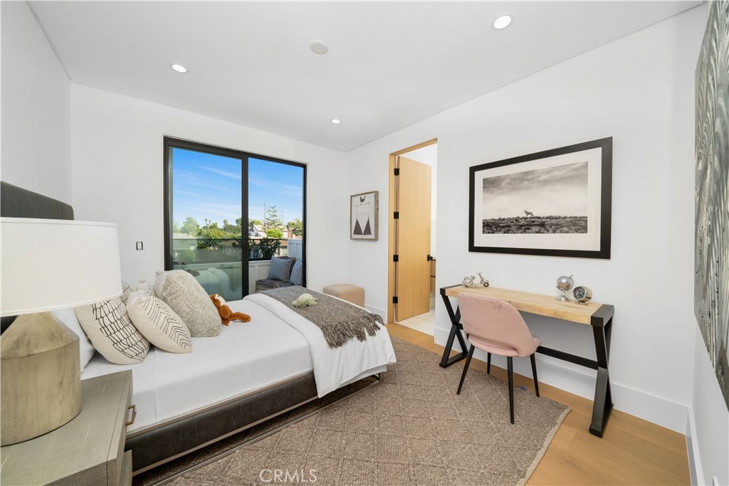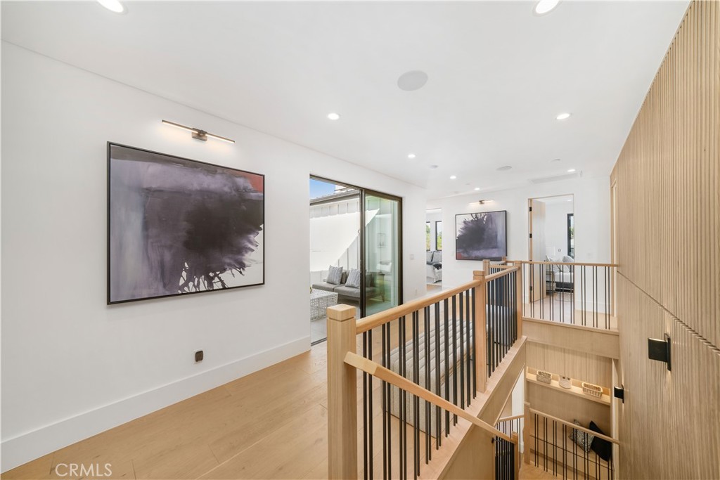 New transitional home on a gated lot in prime Sherman Oaks, with modern flair. Featuring 5 BR – 6 BA in home and detached rec room with approximately 3,600 sqft on an over 7,000 sqft lot. Bright living room with fireplace opens to dining room with white oak accent wall. Gourmet kitchen features stainless-steel appliances, custom cabinetry, center island with bar seating, and walk-in pantry. Kitchen opens to family room with custom built-ins with accent lighting, electric fireplace with bookmatch porcelain mantle wall, and sliding glass doors to covered patio. Backyard features spacious turfed area, detached rec room with half bath and HVAC, saltwater pool/spa with waterfall, BBQ area with bar seating, and exterior pool shower. Primary suite features electric fireplace with porcelain mantle, balcony, walk-in closet with accent lighting, and primary bath with built-ins, shower with porcelain tilework, and soaking tub. Home is completed by entertainer/designer details such as custom woodwork/tilework, spacious upstairs patio, surround sound speakers, landscape lighting, solar panels, security system with alarm/cameras, and Control 4 smart home system.