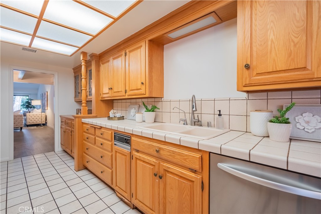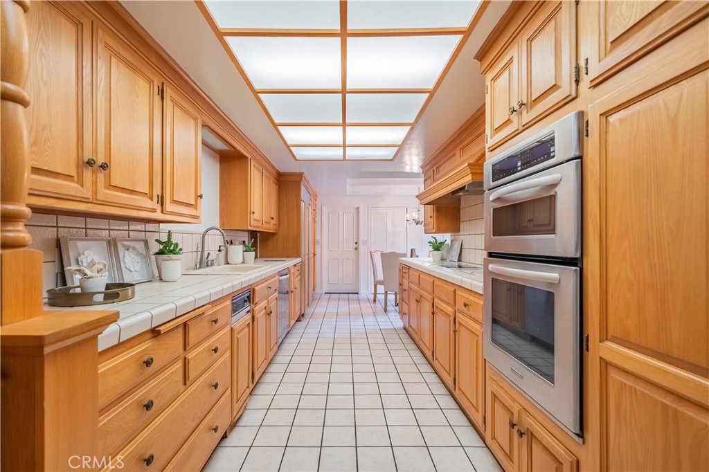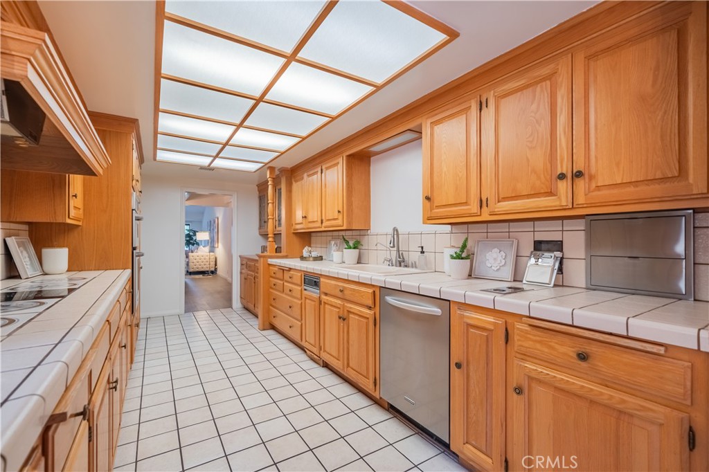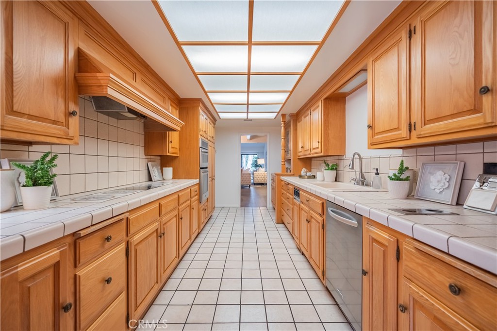 The traditional galley-style kitchen designed for functionality features custom tile counters, brown cabinetry, a built-in napkin holder, a counter