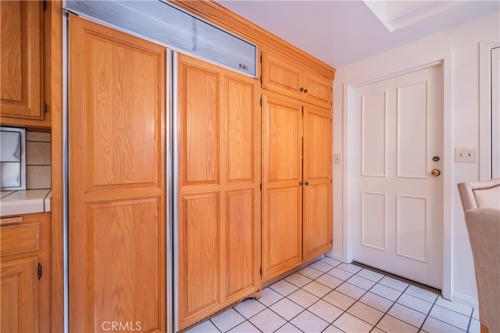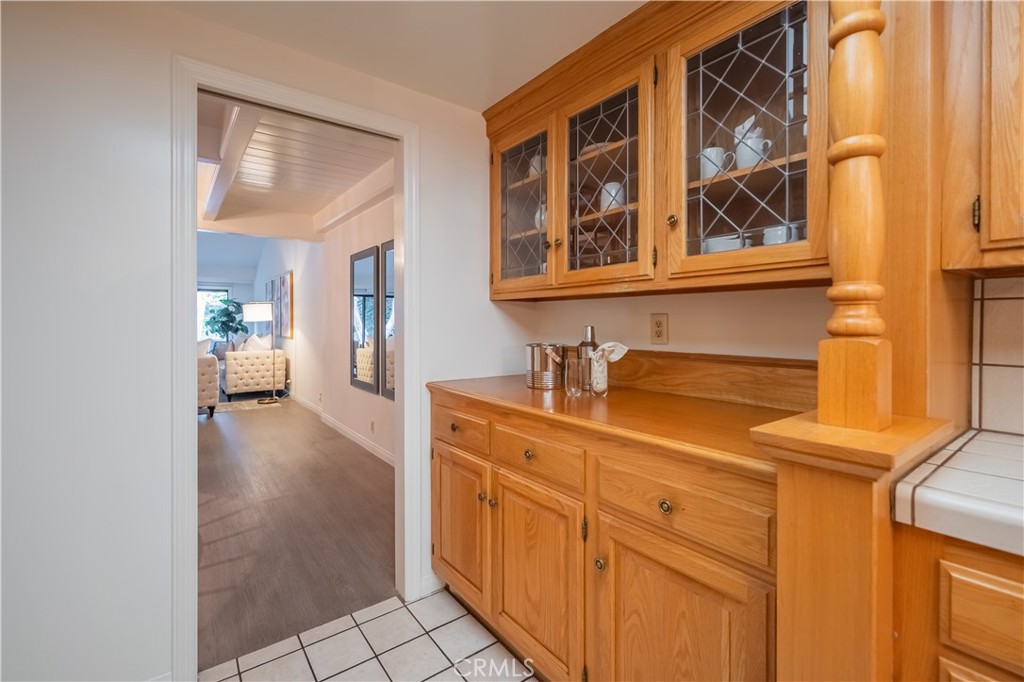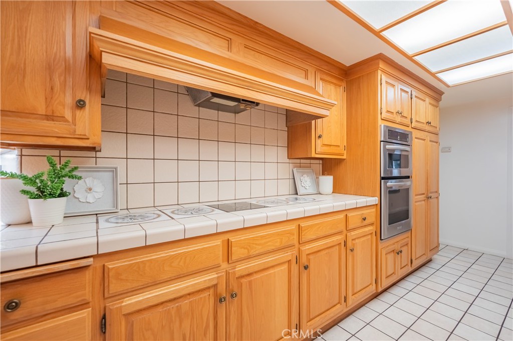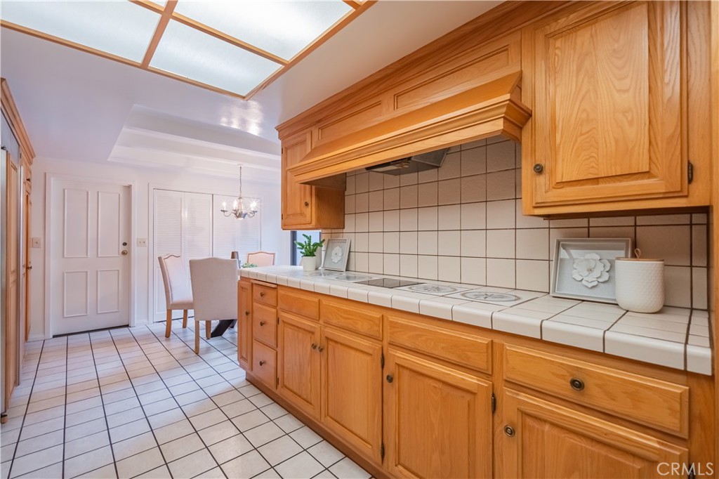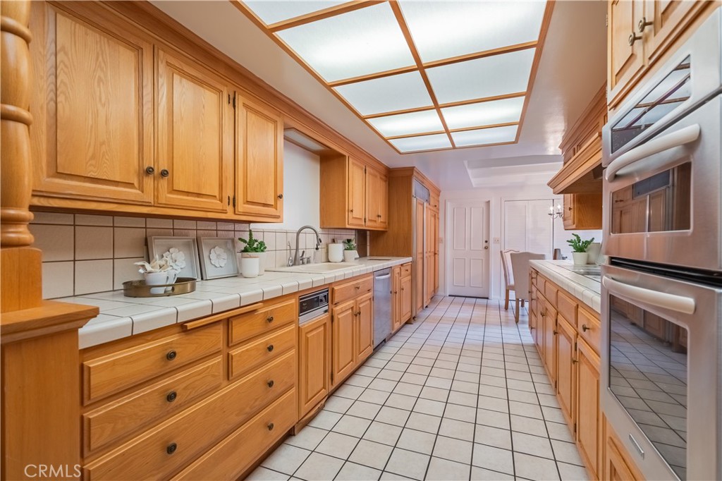 The traditional galley-style kitchen designed for functionality features custom tile counters, brown cabinetry, a built-in napkin holder, a counter