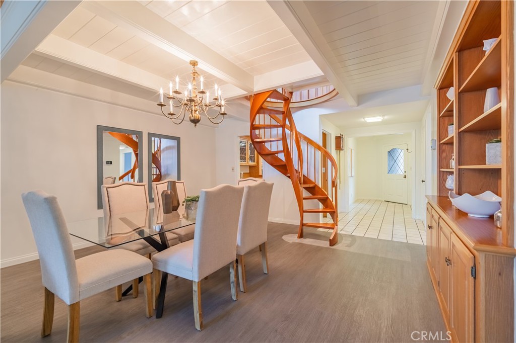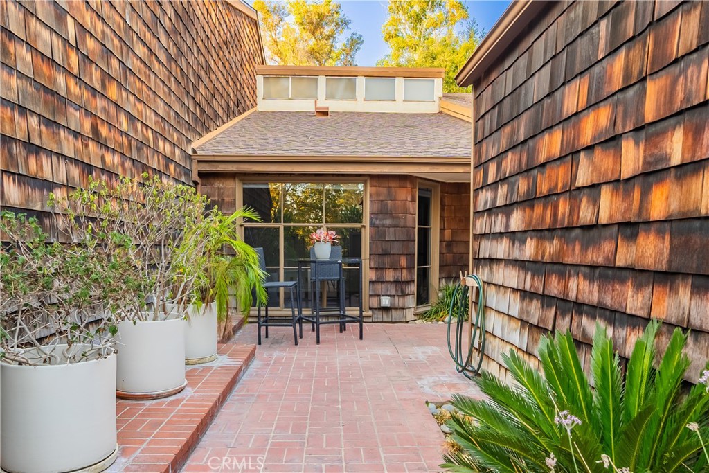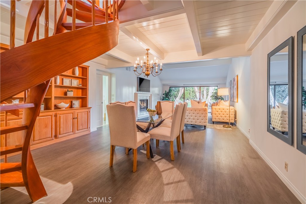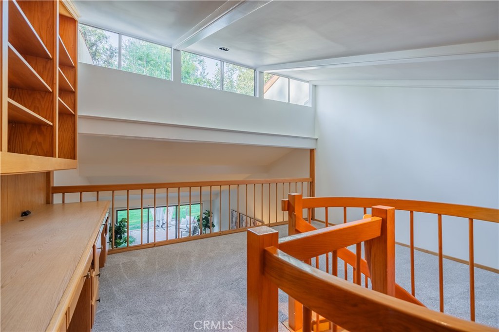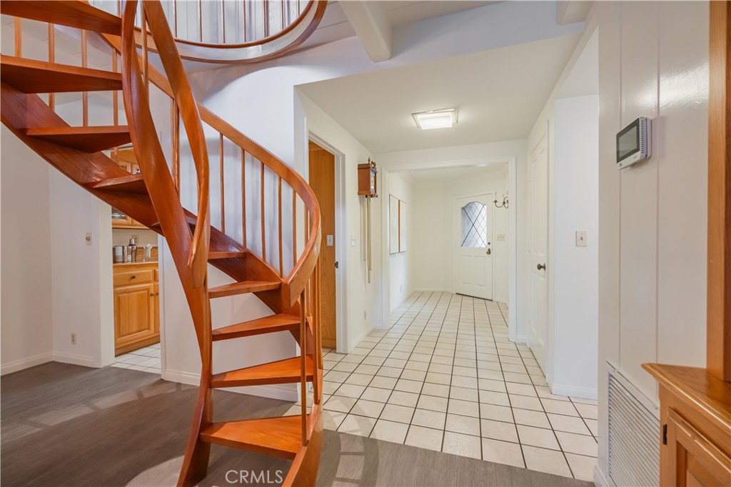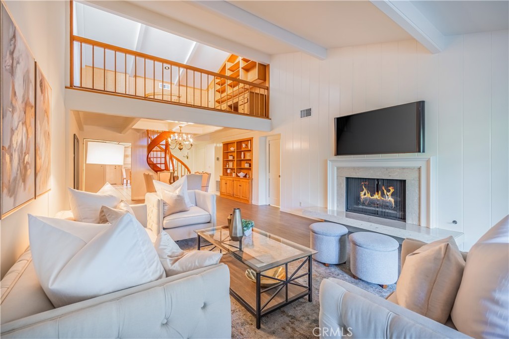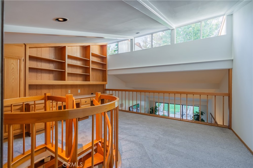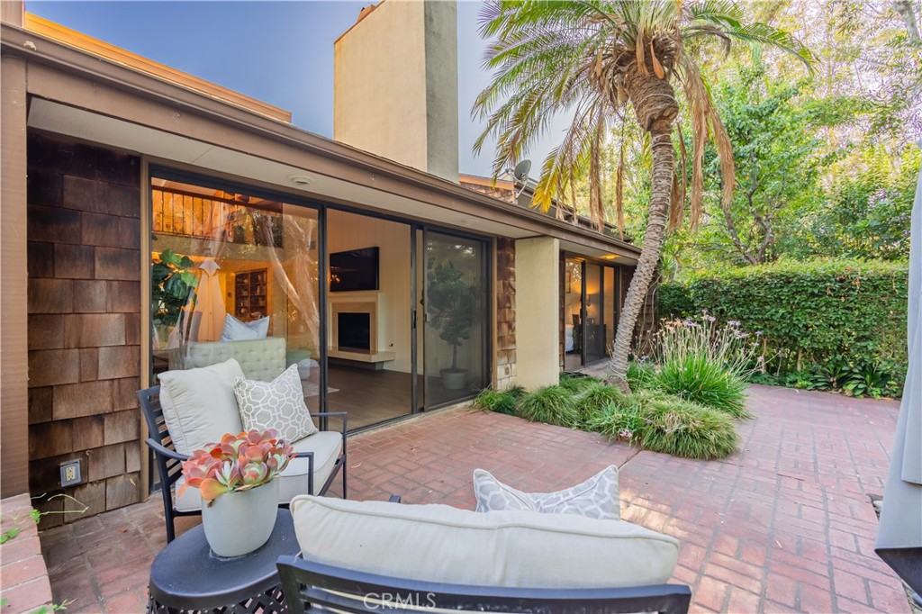 the private courtyard. The living room includes a stone fireplace & views of the brick patio & lush landscape. A custom wood spiral staircase leads